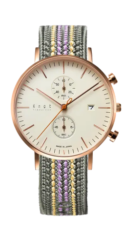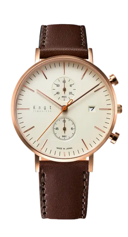 懐中時計をベースとし、視認性を重んじた精悍なフェイスデザイン。39mmの少し大きめなケースは、男性はもちろん女性があえて大きめを着用するのもおすすめです。ヴィンテージ感漂う画鋲型のプッシュボタンや、美しく放射状に輝く2カウンターなどデザインの細部に至るまでこだわり抜いたKnot定番のクロノグラフ。