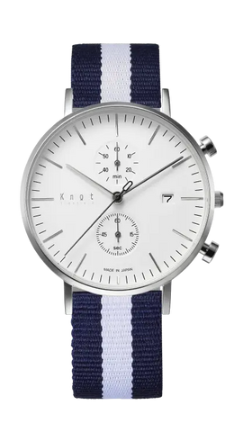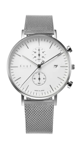 懐中時計をベースとし、視認性を重んじた精悍なフェイスデザイン。39mmの少し大きめなケースは、男性はもちろん女性があえて大きめを着用するのもおすすめです。ヴィンテージ感漂う画鋲型のプッシュボタンや、美しく放射状に輝く2カウンターなどデザインの細部に至るまでこだわり抜いたKnot定番のクロノグラフ。
