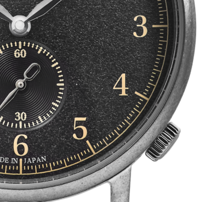 3針すべてにリーフ針を採用。さらに機械式らしさを際立たせるために、細かくミニッツトラックが刻まれたデザインに仕上げました。