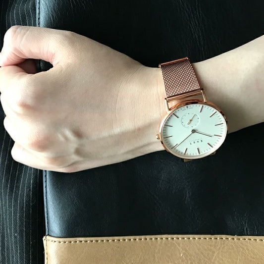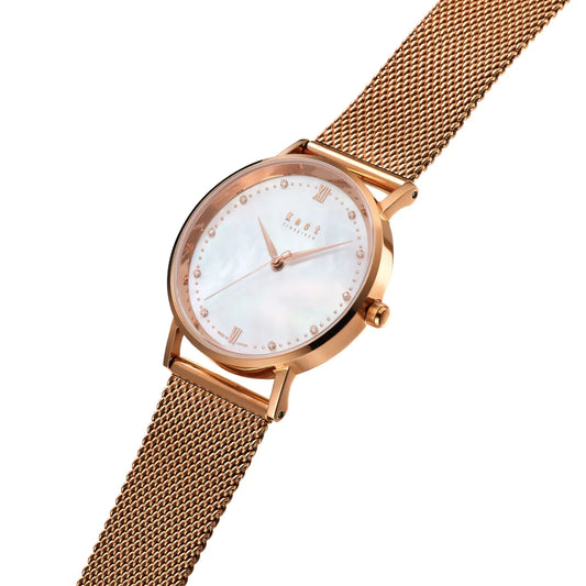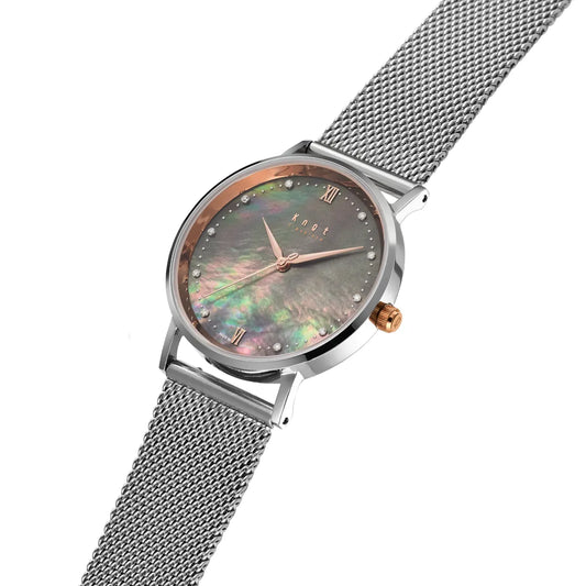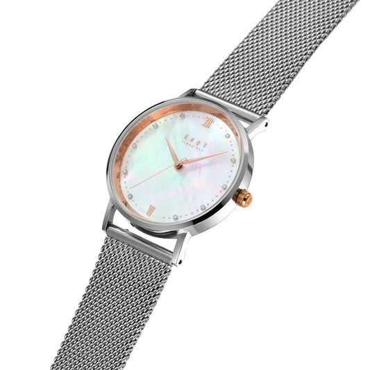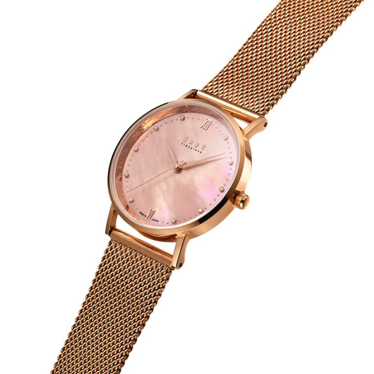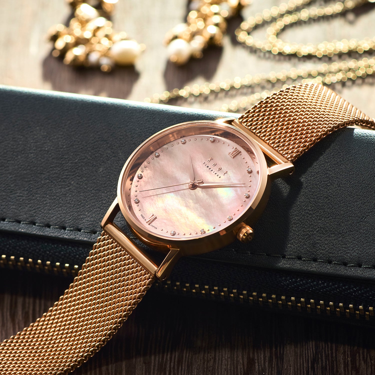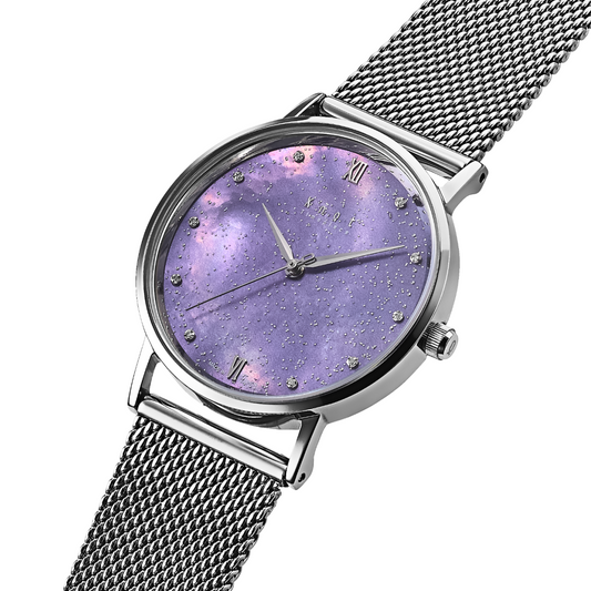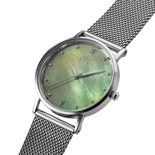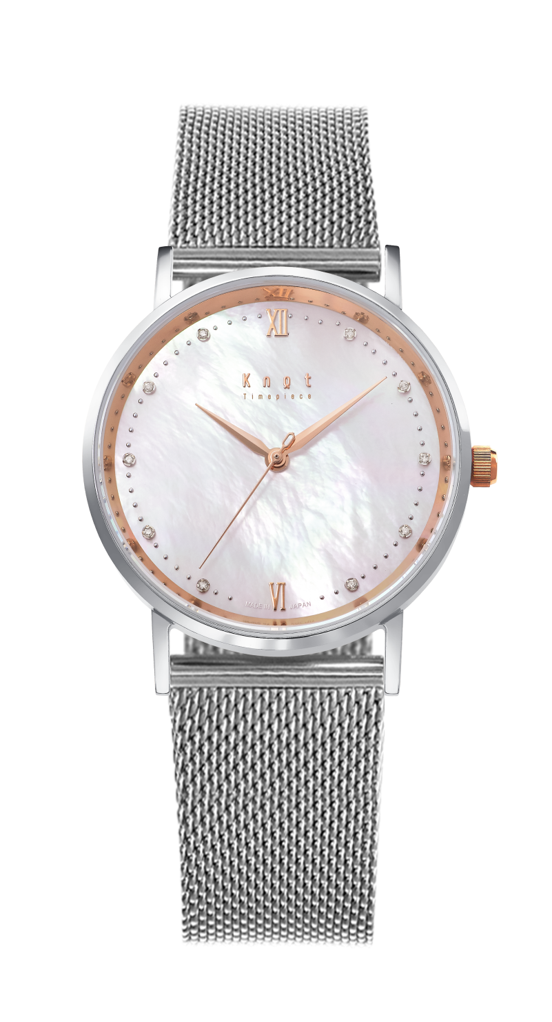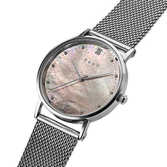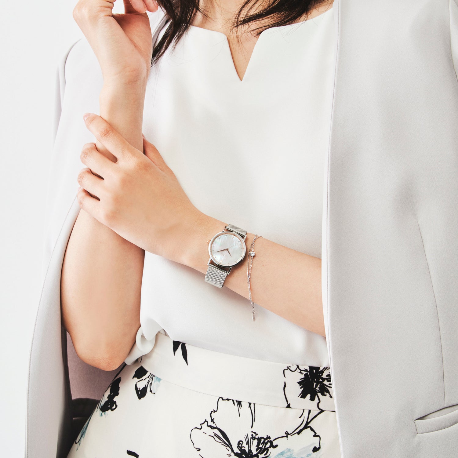 マザーオブパールが輝き、特別な日のスタイルにマッチするソーラーウォッチ。スマートなステンレスメッシュストラップと合わせれば、よりスタイリッシュな印象に。