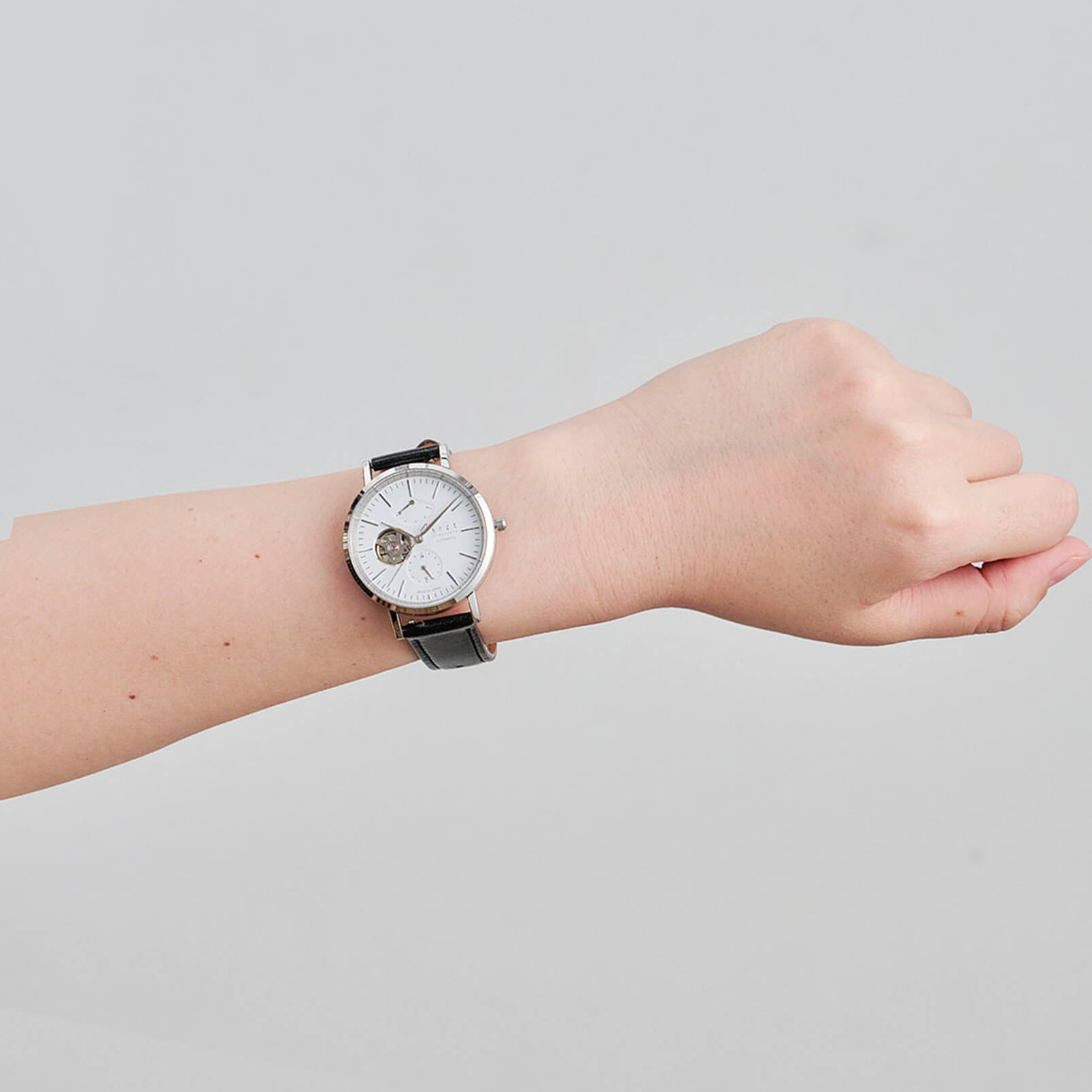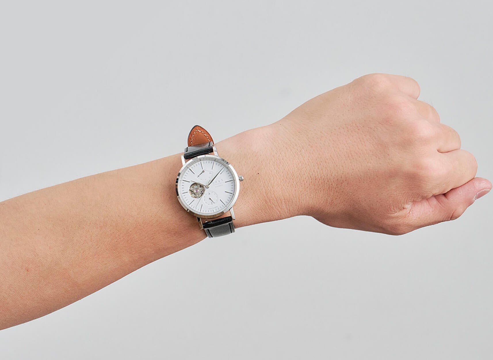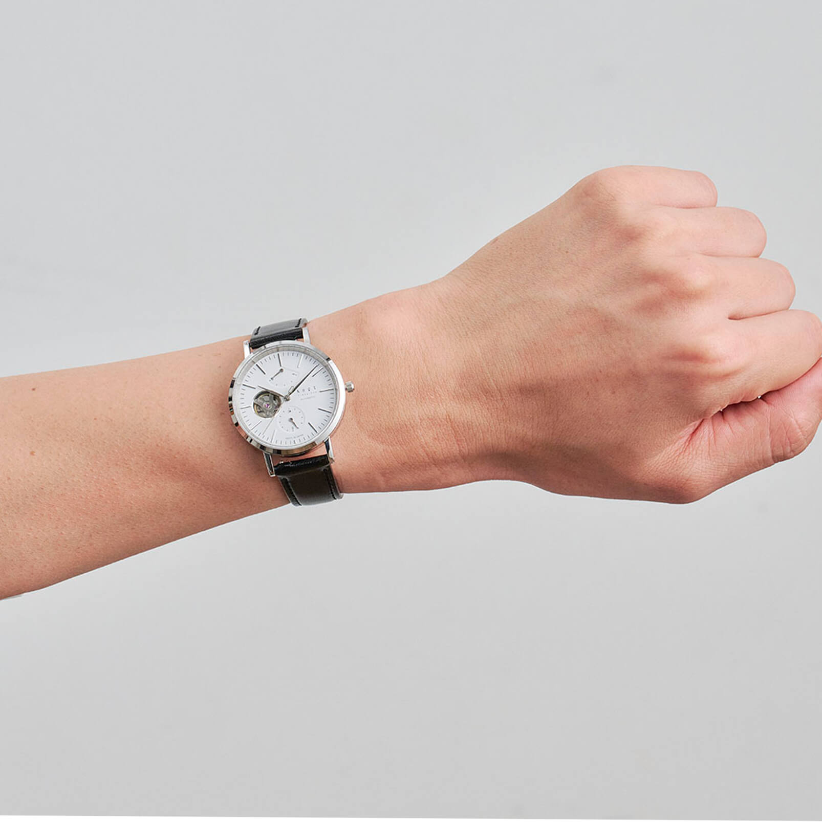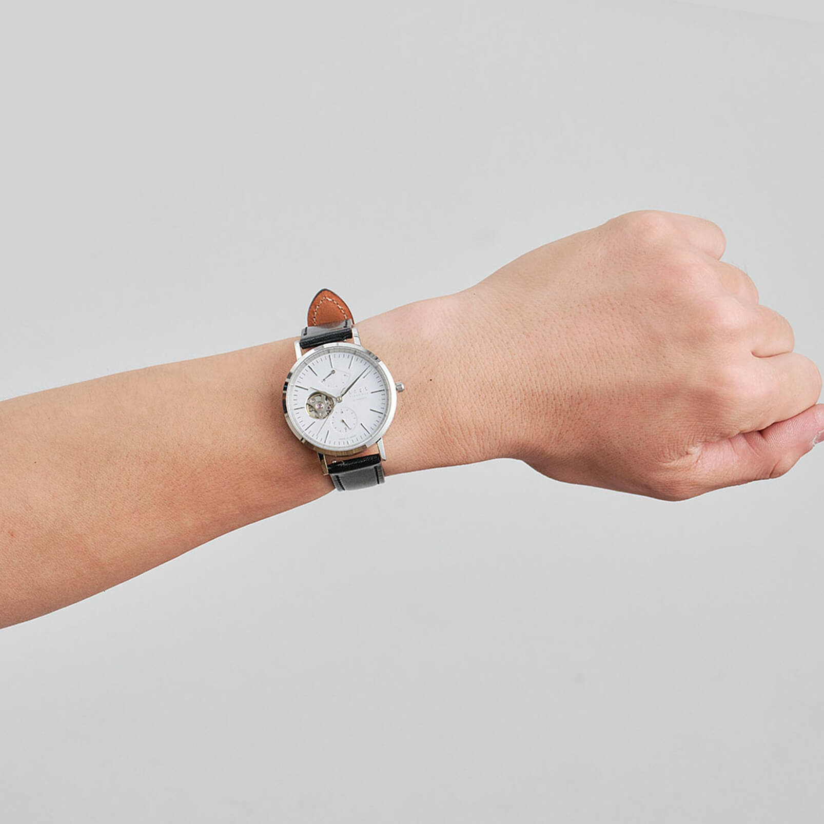 文字板側、9時位置の小窓から、時を刻む心臓部であるテンプの動きを見ることができます。オープンハート用に特別に設計されたムーブメントならではの、精工なギミックと鼓動を感じることができる仕様です。