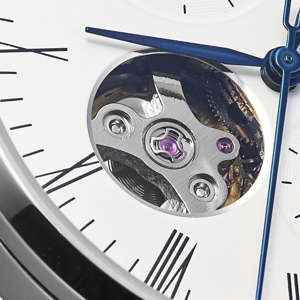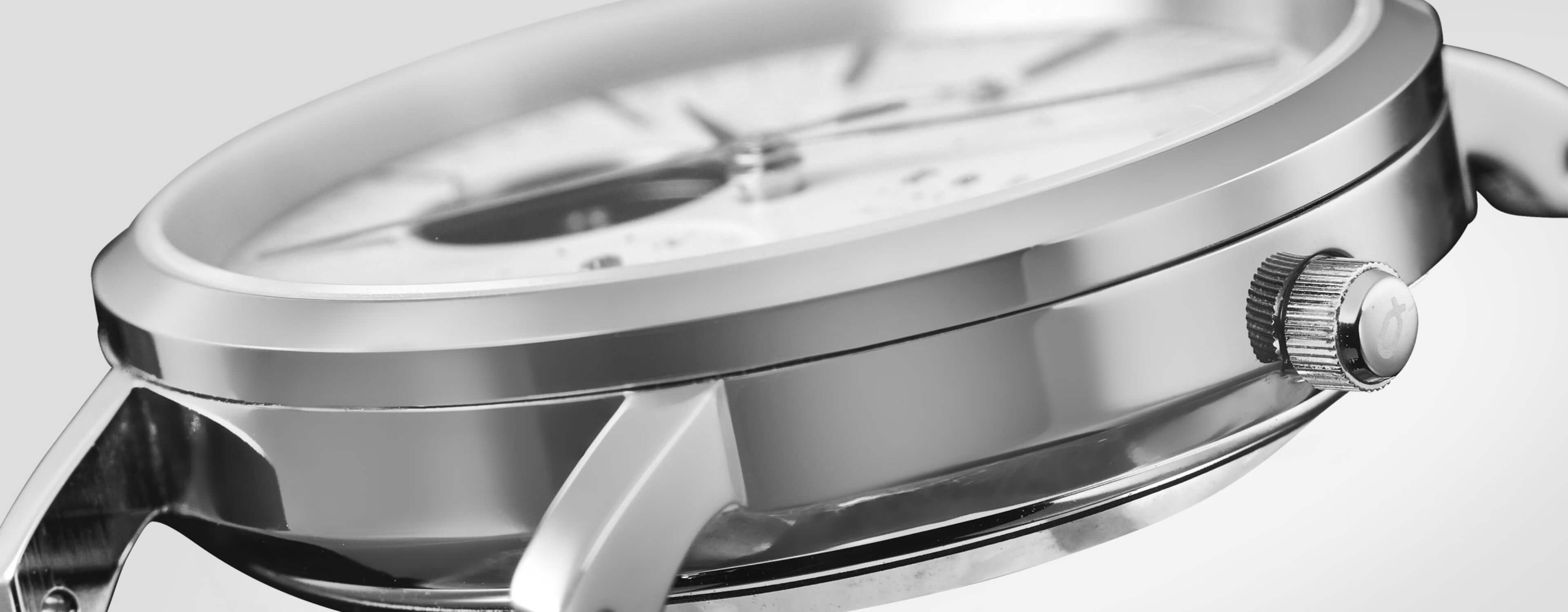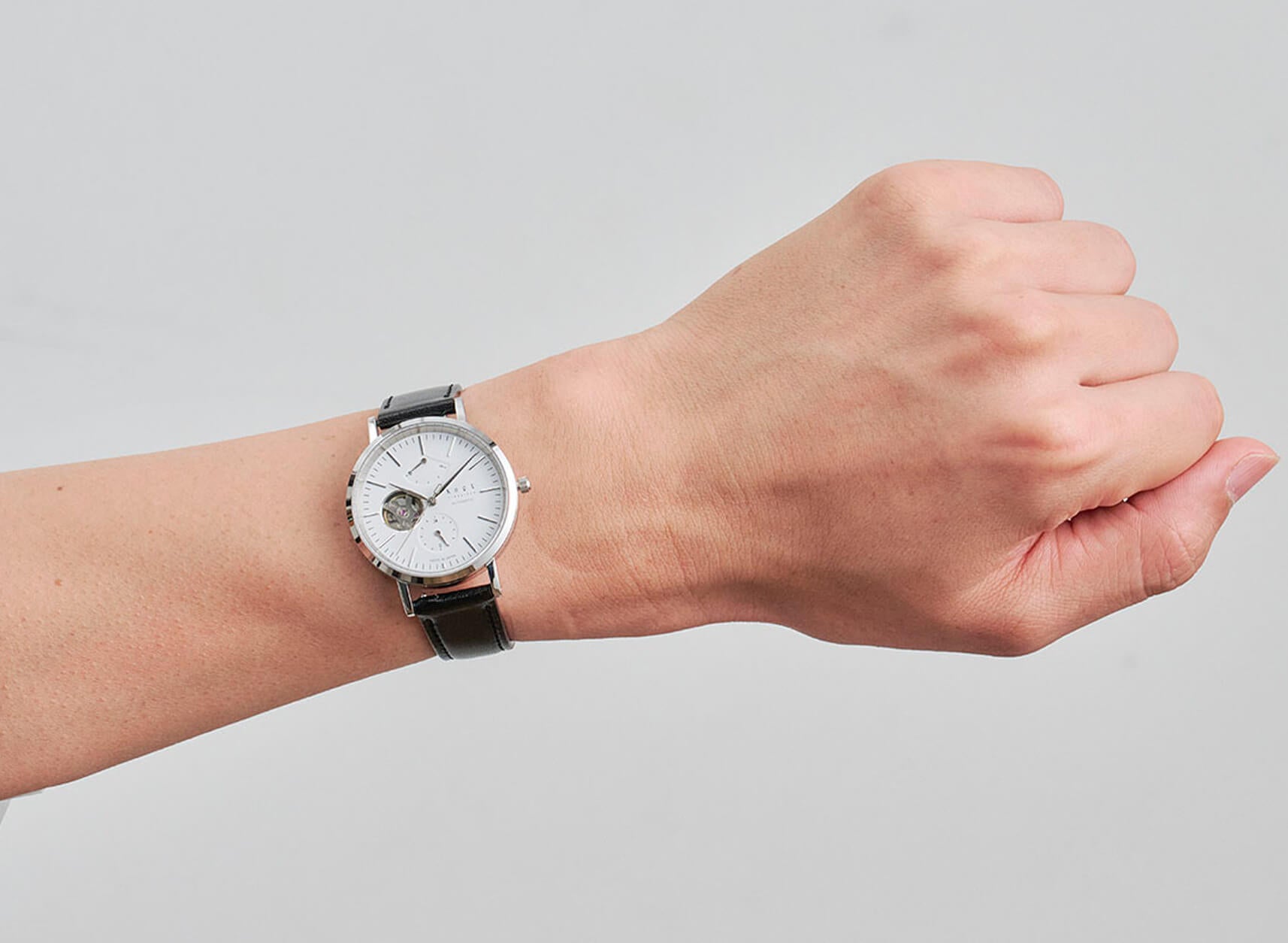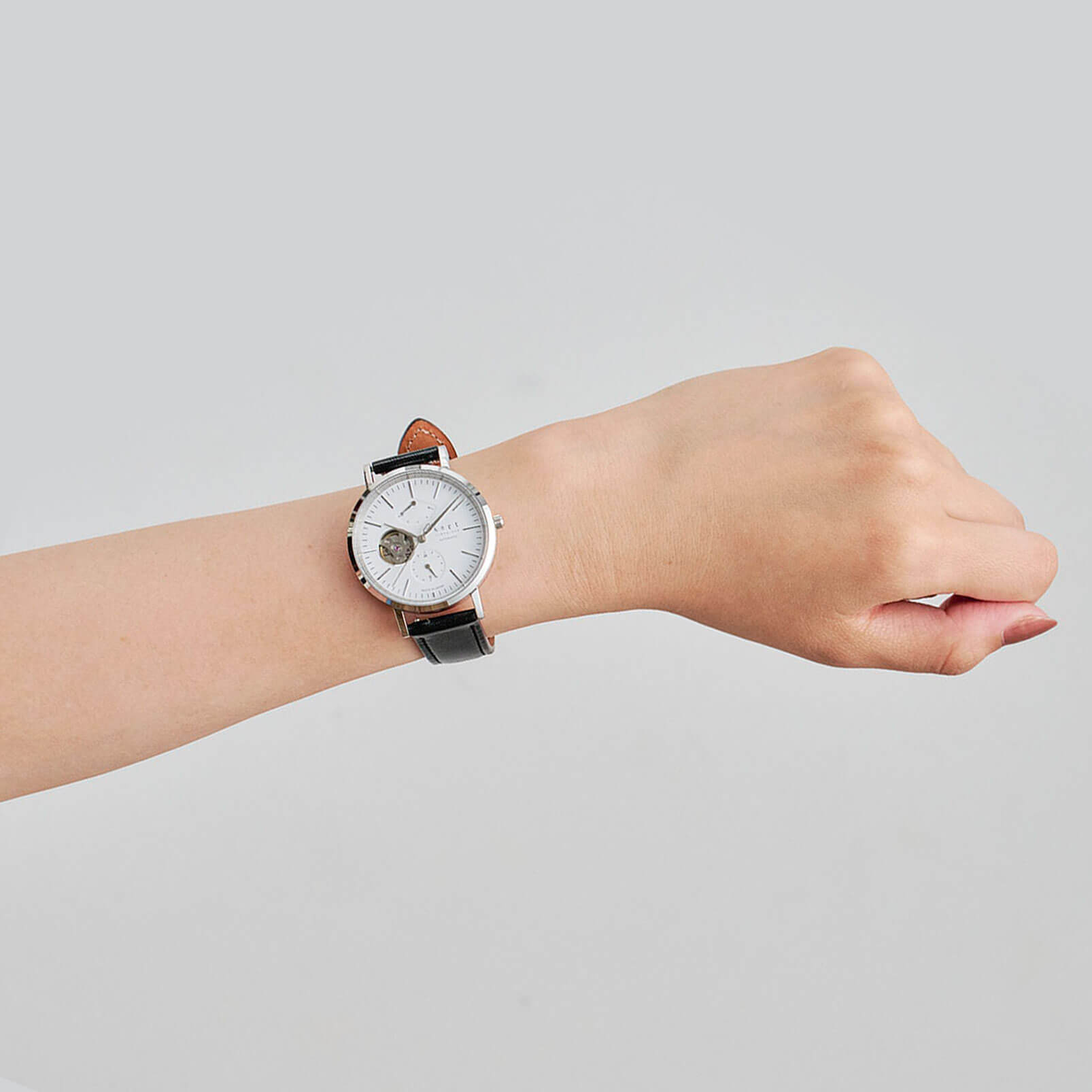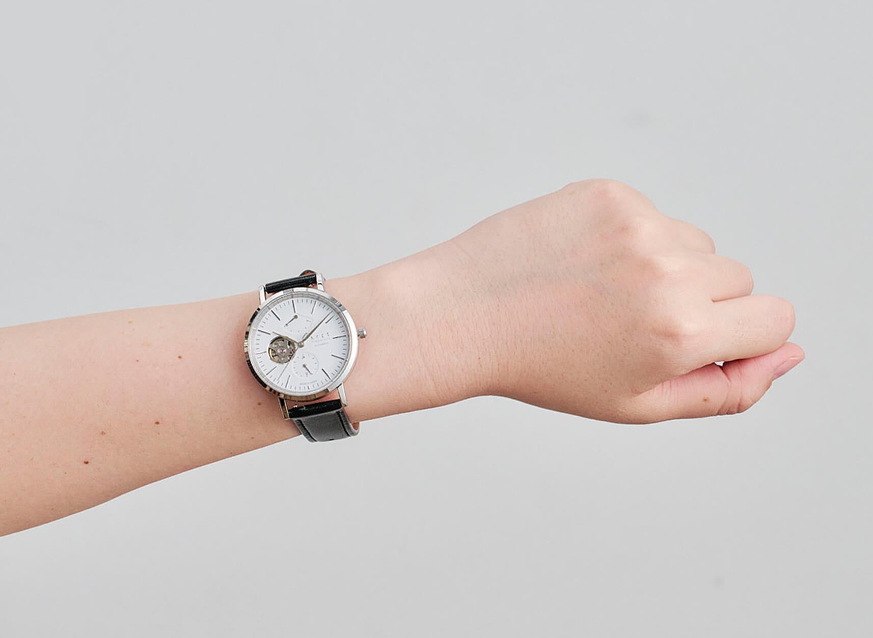 文字板側、9時位置の小窓から、時を刻む心臓部であるテンプの動きを見ることができます。オープンハート用に特別に設計されたムーブメントならではの、精工なギミックと鼓動を感じることができる仕様です。