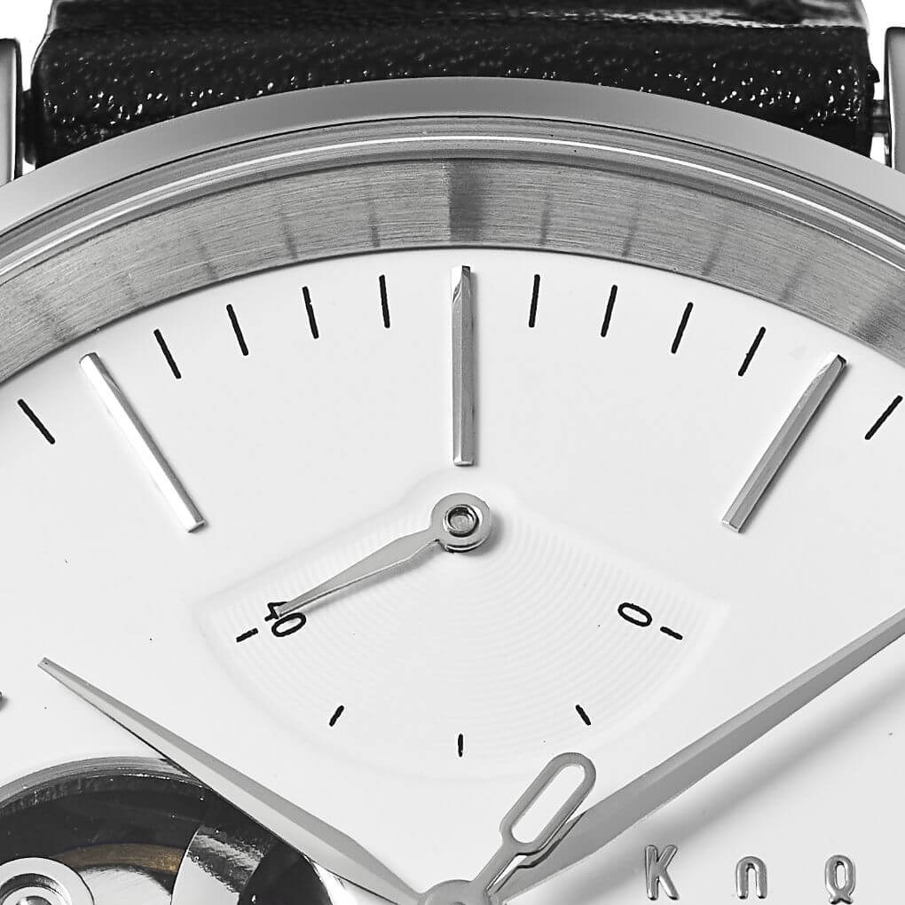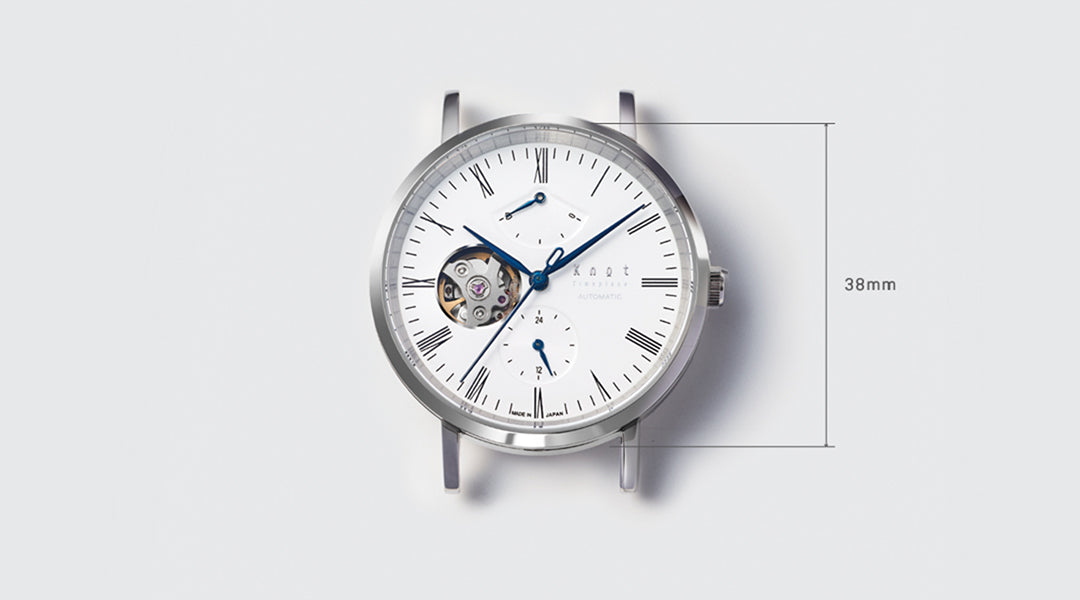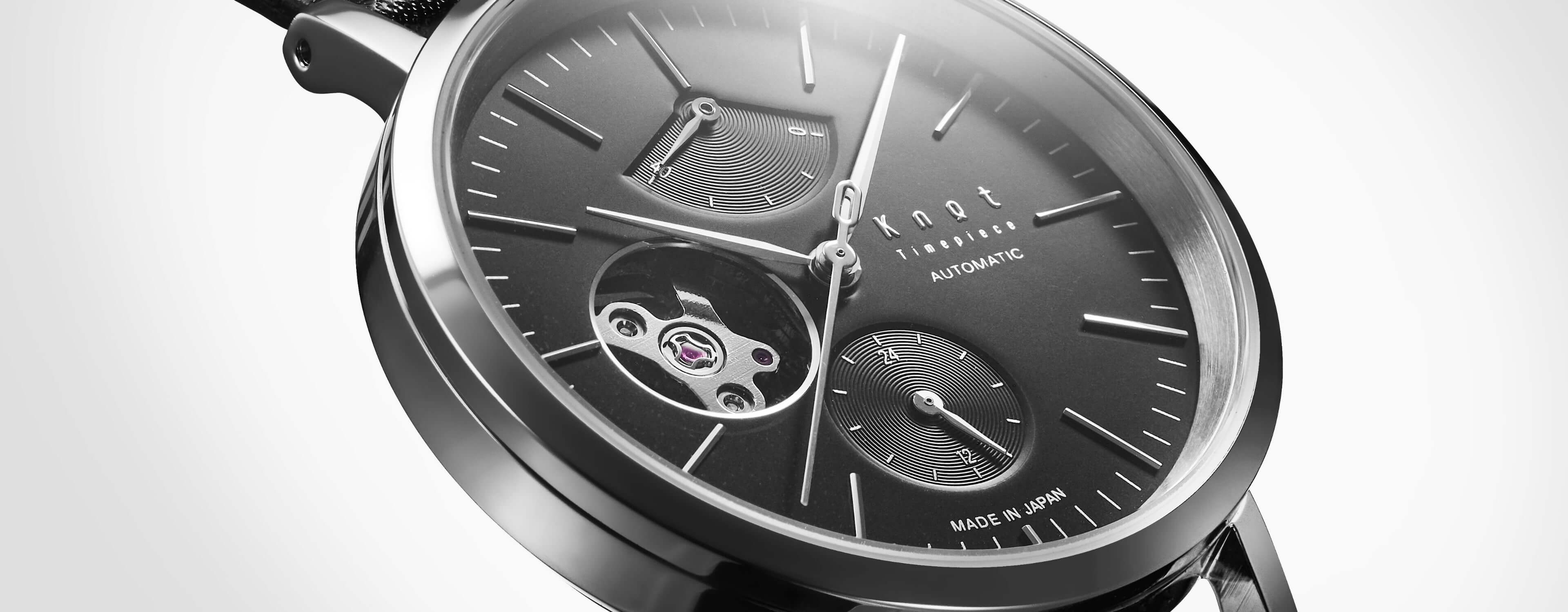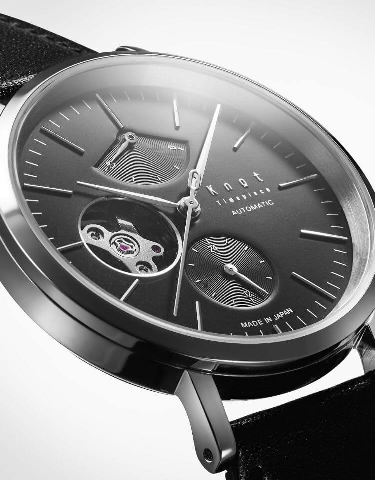 サファイアガラスとは宝石のサファイアと同じ組成のガラス。モース硬度においてダイアモンド「10」に次ぐ、最高クラスの「9」を誇る、傷に強いサファイアガラスをKnotではすべての時計にサファイアガラスを標準装備。さらに機械式のモデルは片面無反射コーティングを施しています。