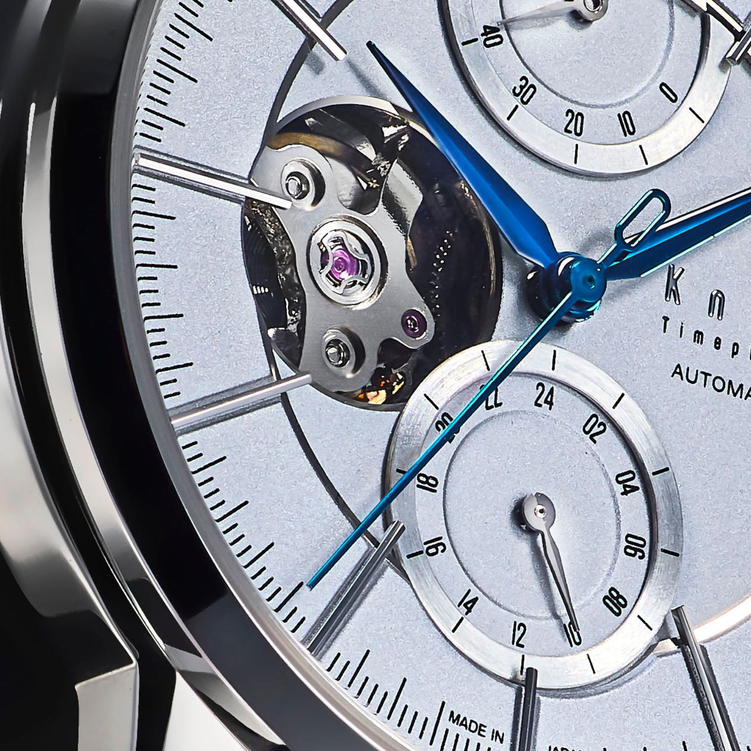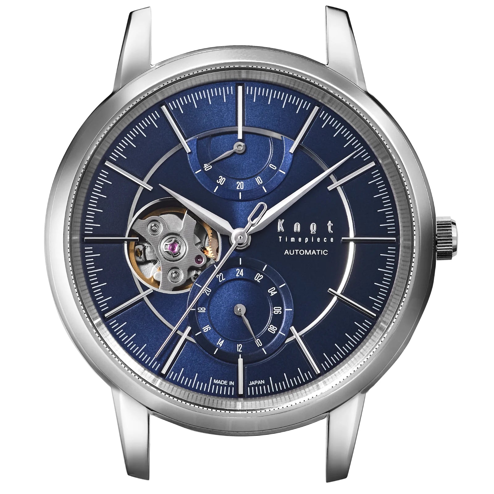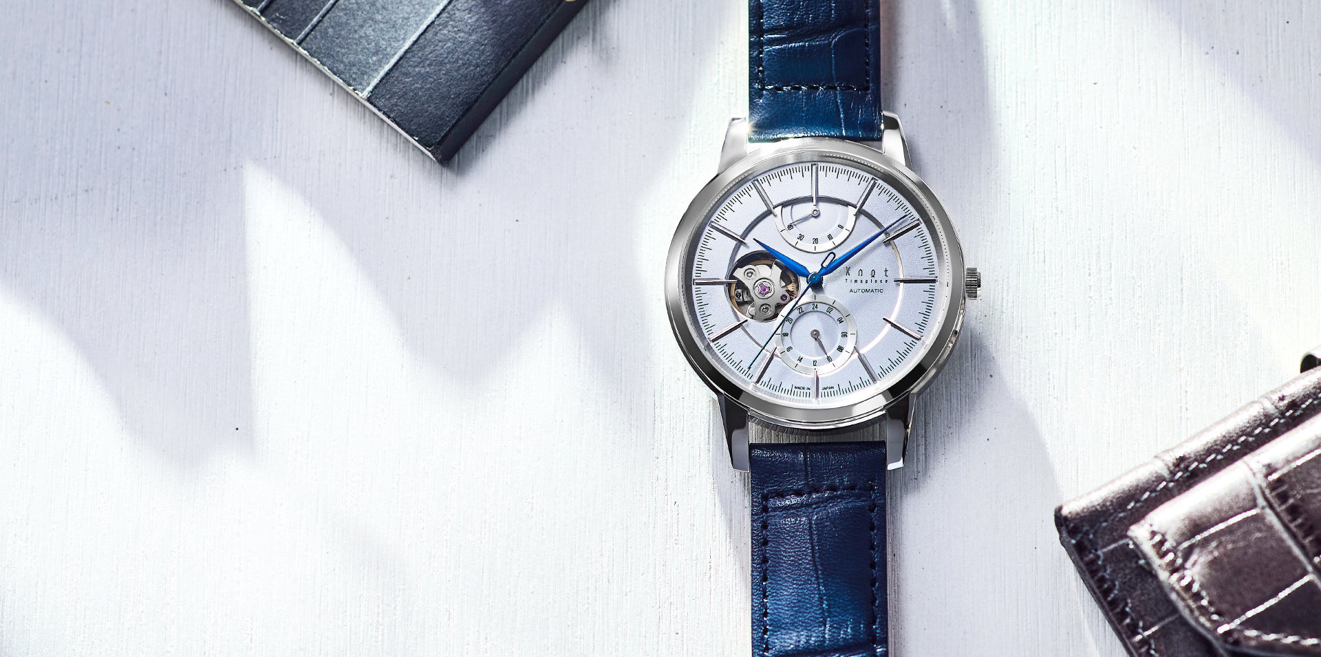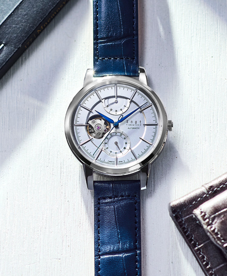 サファイアガラスとは宝石のサファイアと同じ組成のガラス。モース硬度においてダイアモンド「10」に次ぐ、最高クラスの「9」を誇る、傷に強いサファイアガラスをKnotではすべての時計にサファイアガラスを標準装備。さらに機械式のモデルは片面無反射コーティングを施しています。