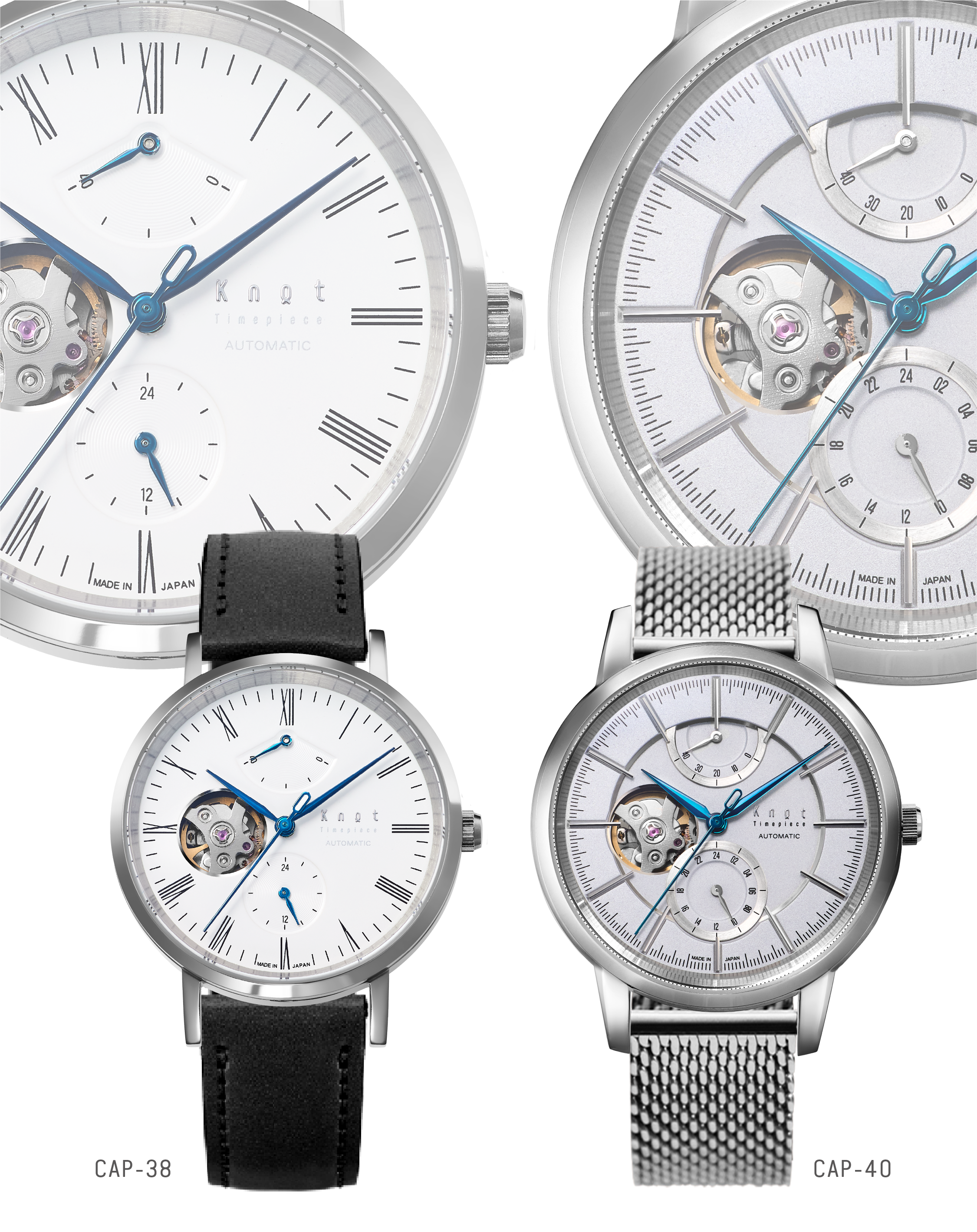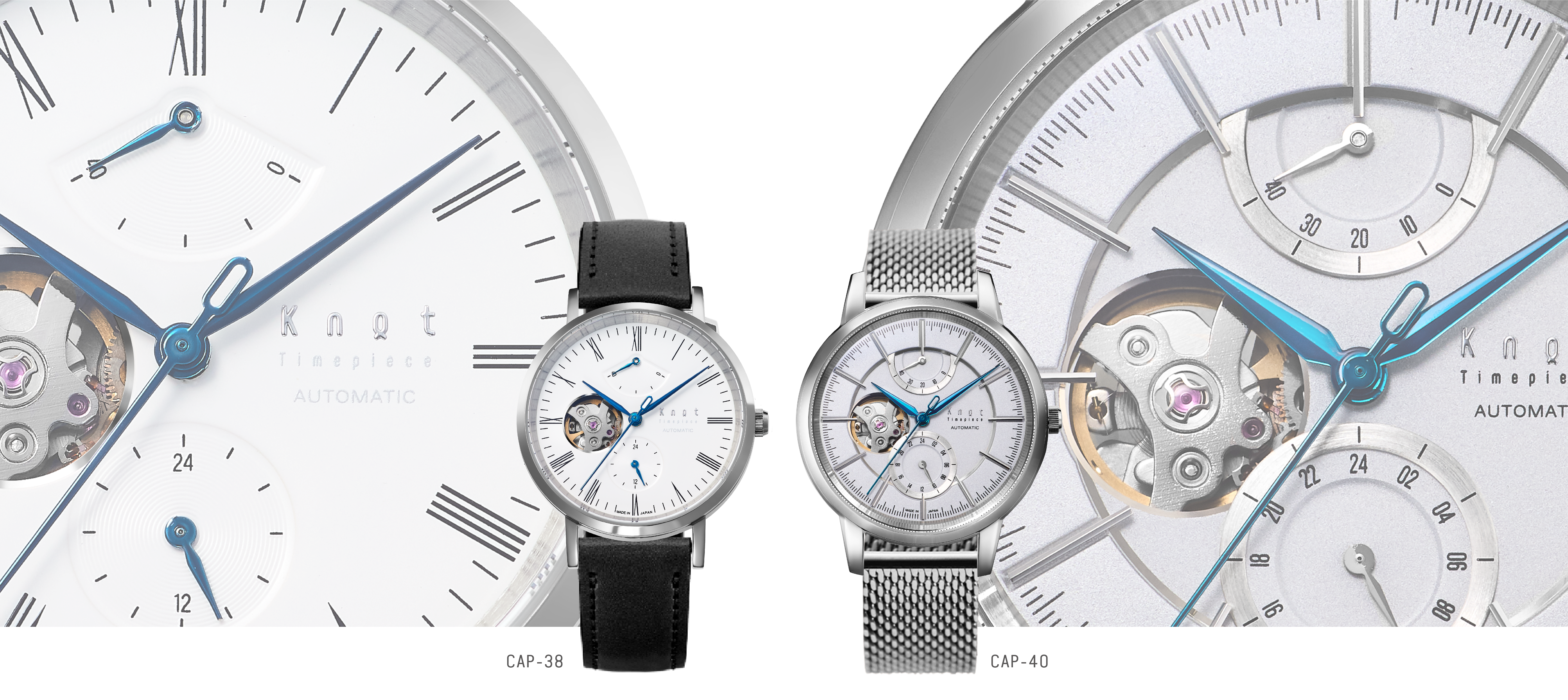 シンプルでスリム、女性でも使いやすいCAP-38、質感の違いで見せるレイヤー構造のダイヤルデザインとボールドなラグケースで腕元で存在感を放つCAP-40。2つのメカニカルオープンハートをご用意しております。