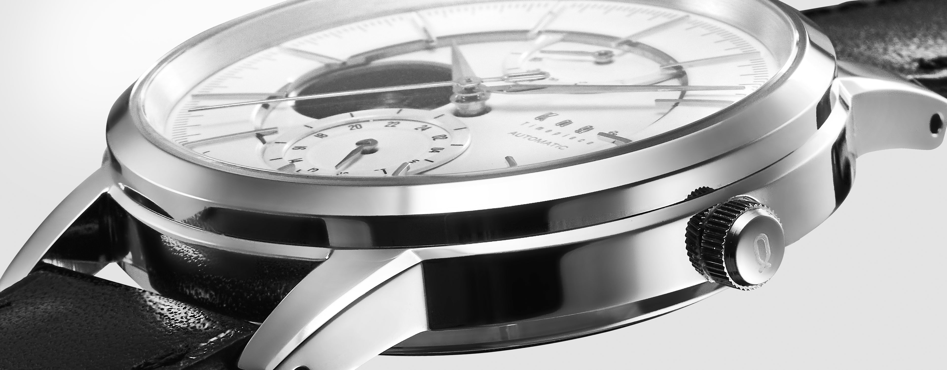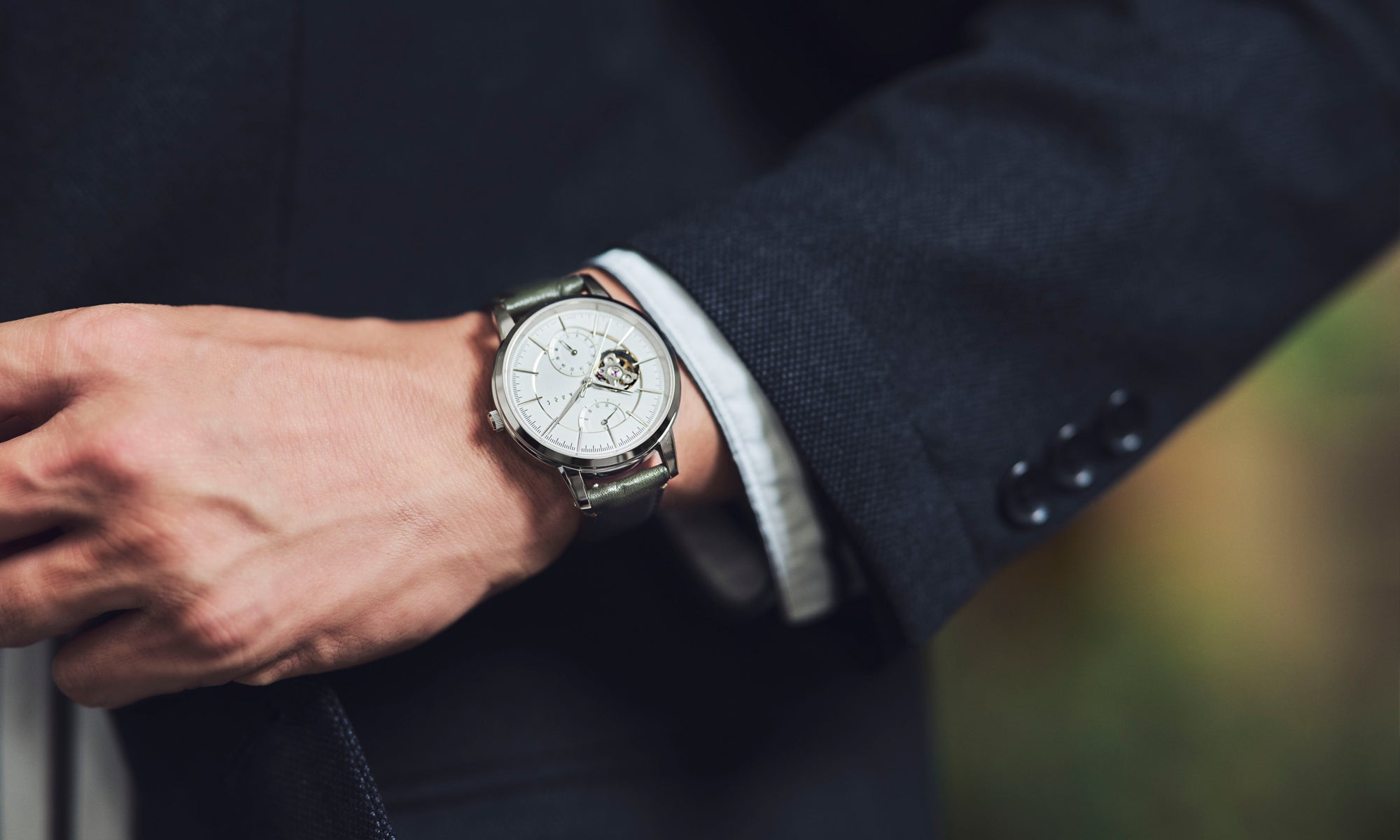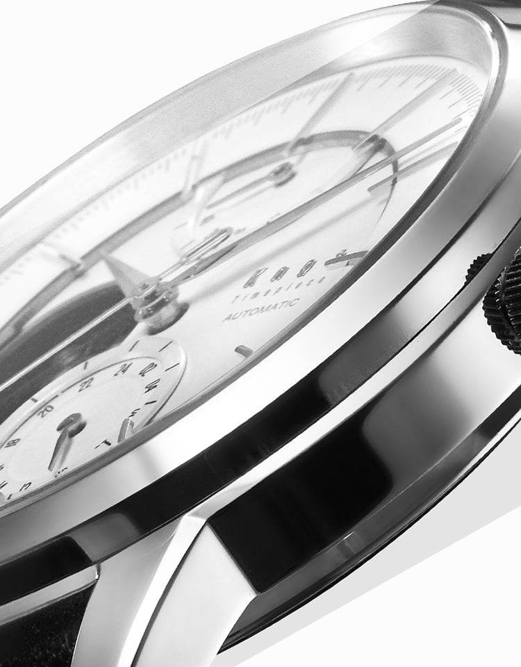 光のコントラストが美しく映えるボールドな山形の針、質感の違うレイヤー構造で光と影を美しく演出するダイヤルデザイン。