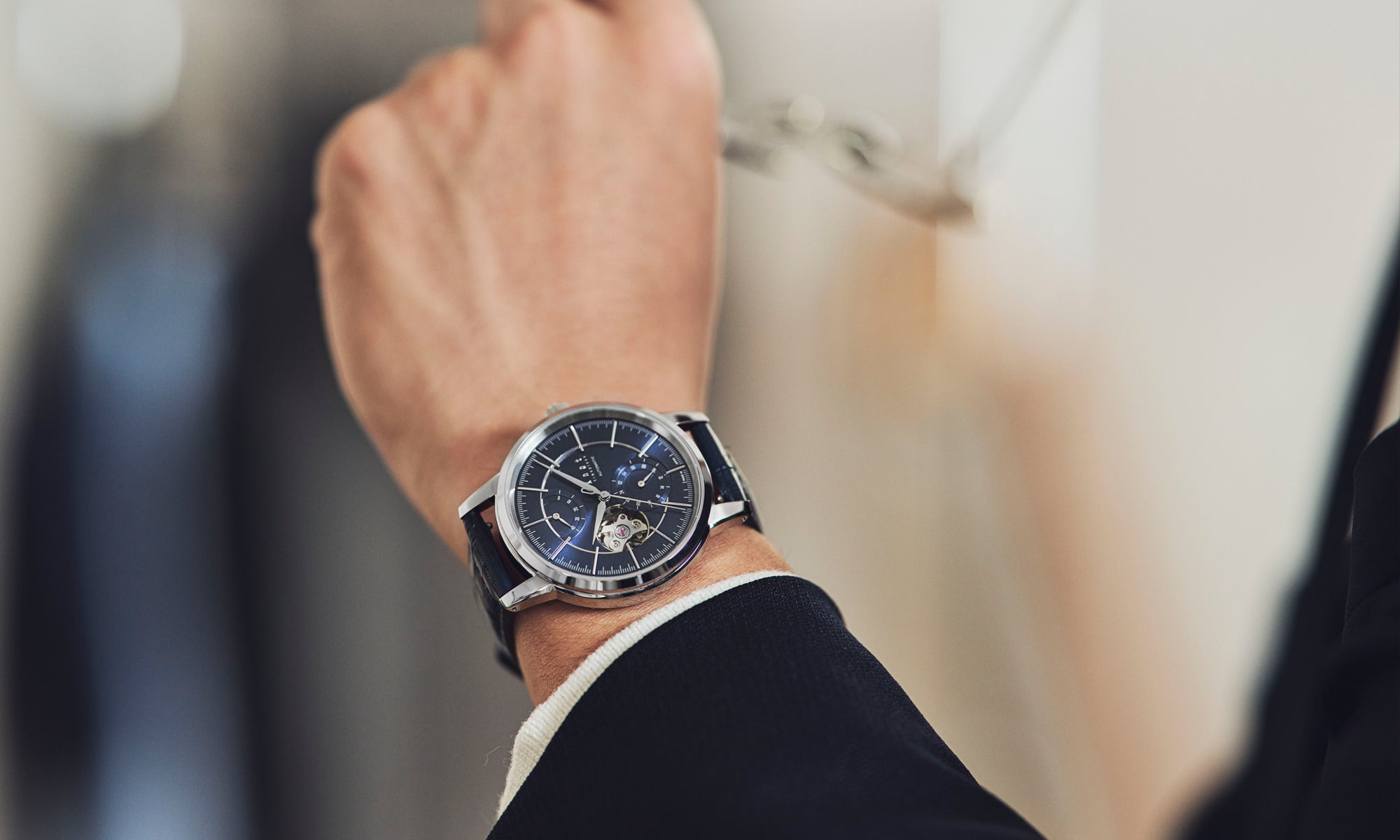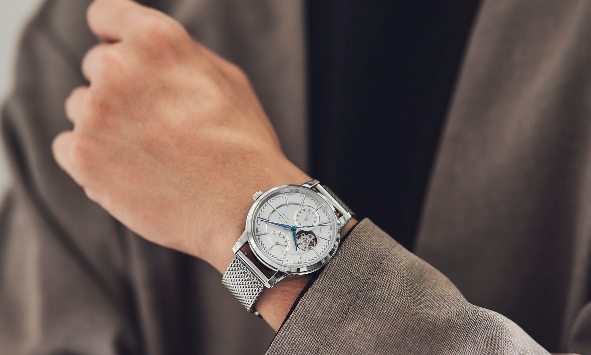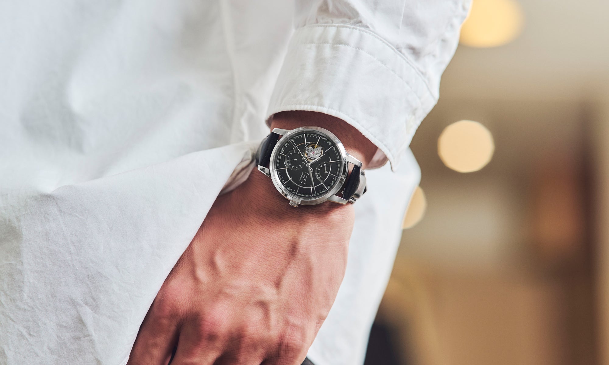 光のコントラストが美しく映えるボールドな山形の針、質感の違うレイヤー構造で光と影を美しく演出するダイヤルデザイン。
