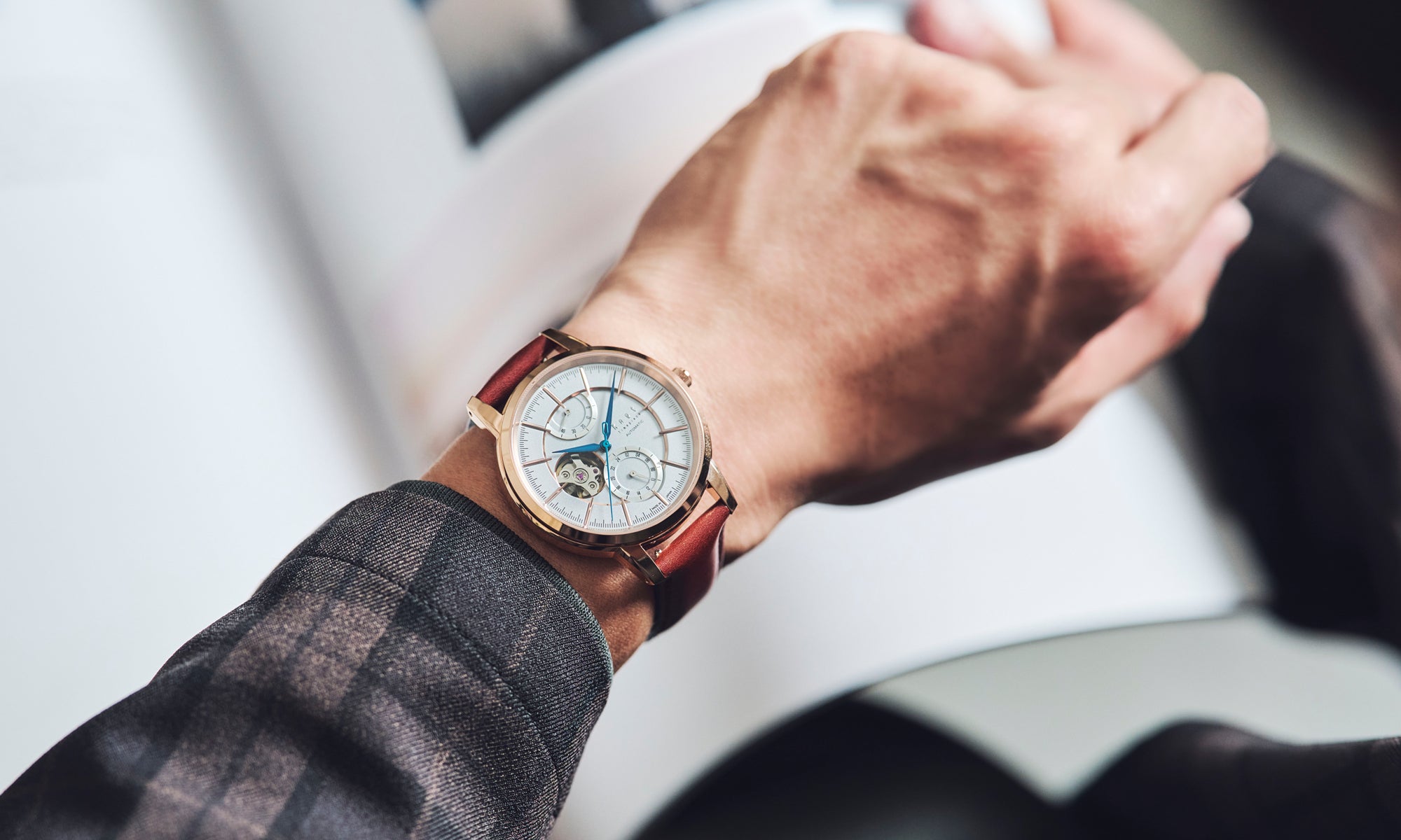 文字板側、9時位置の小窓から、時を刻む心臓部であるテンプの動きを見ることができます。オープンハート用に特別に設計されたムーブメントならではの、精工なギミックと鼓動を感じることができる仕様です。