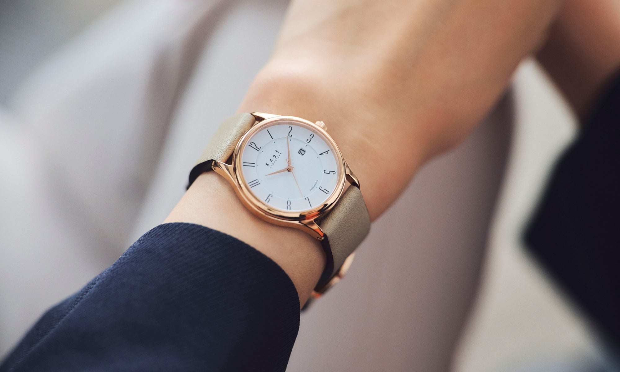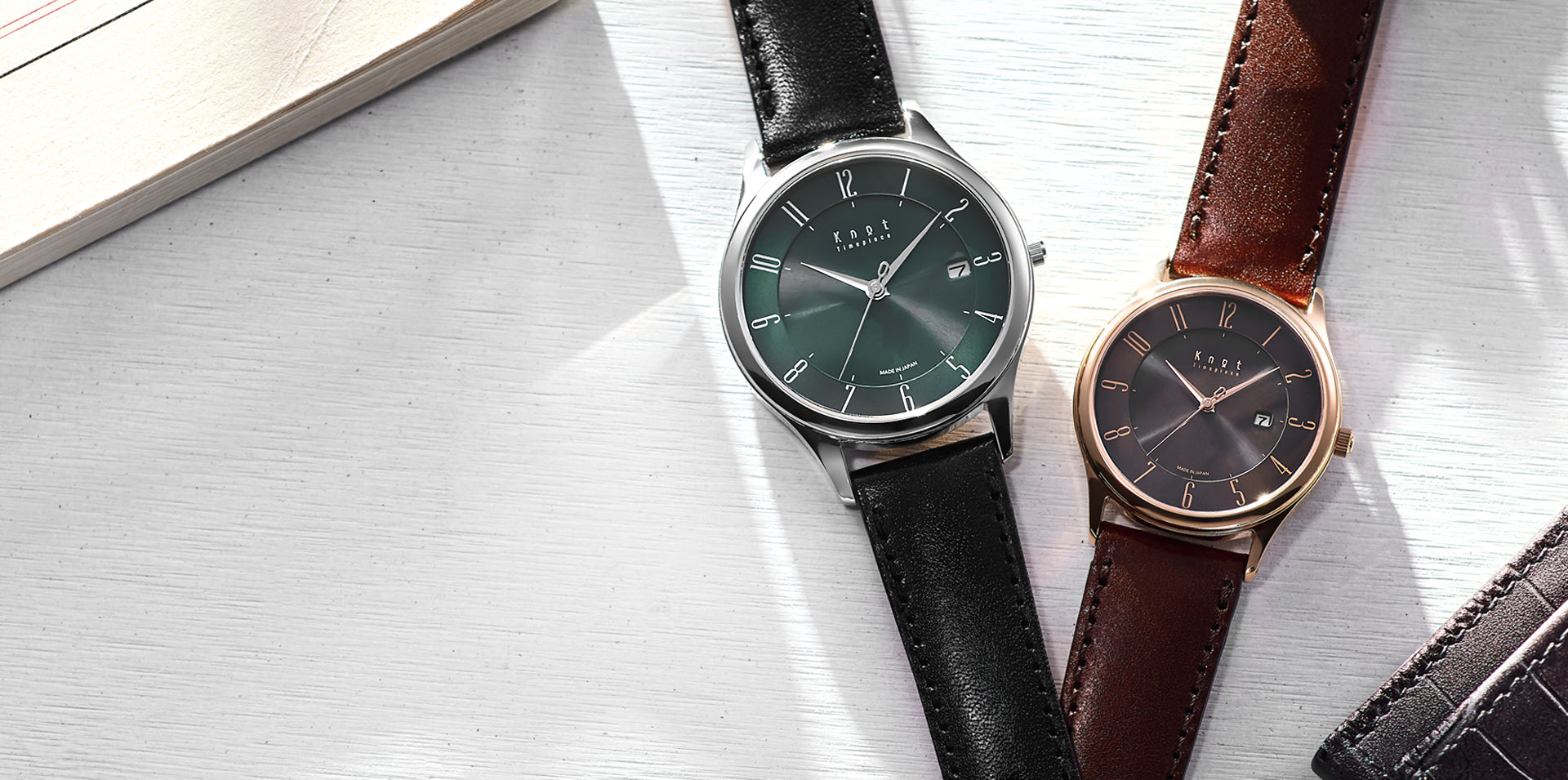サファイアガラスとは宝石のサファイアと同じ組成のガラス。モース硬度においてダイアモンド「10」に次ぐ、最高クラスの「9」を誇る、傷に強いサファイアガラスをKnotではすべての時計に標準装備しています。