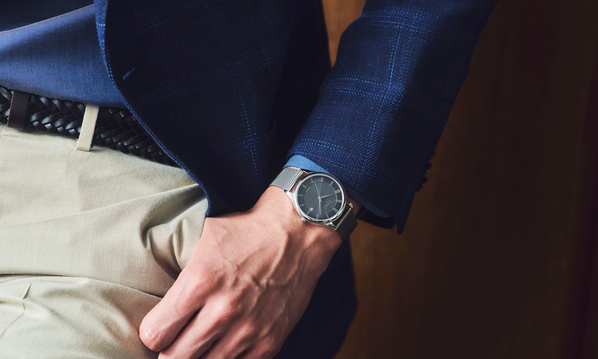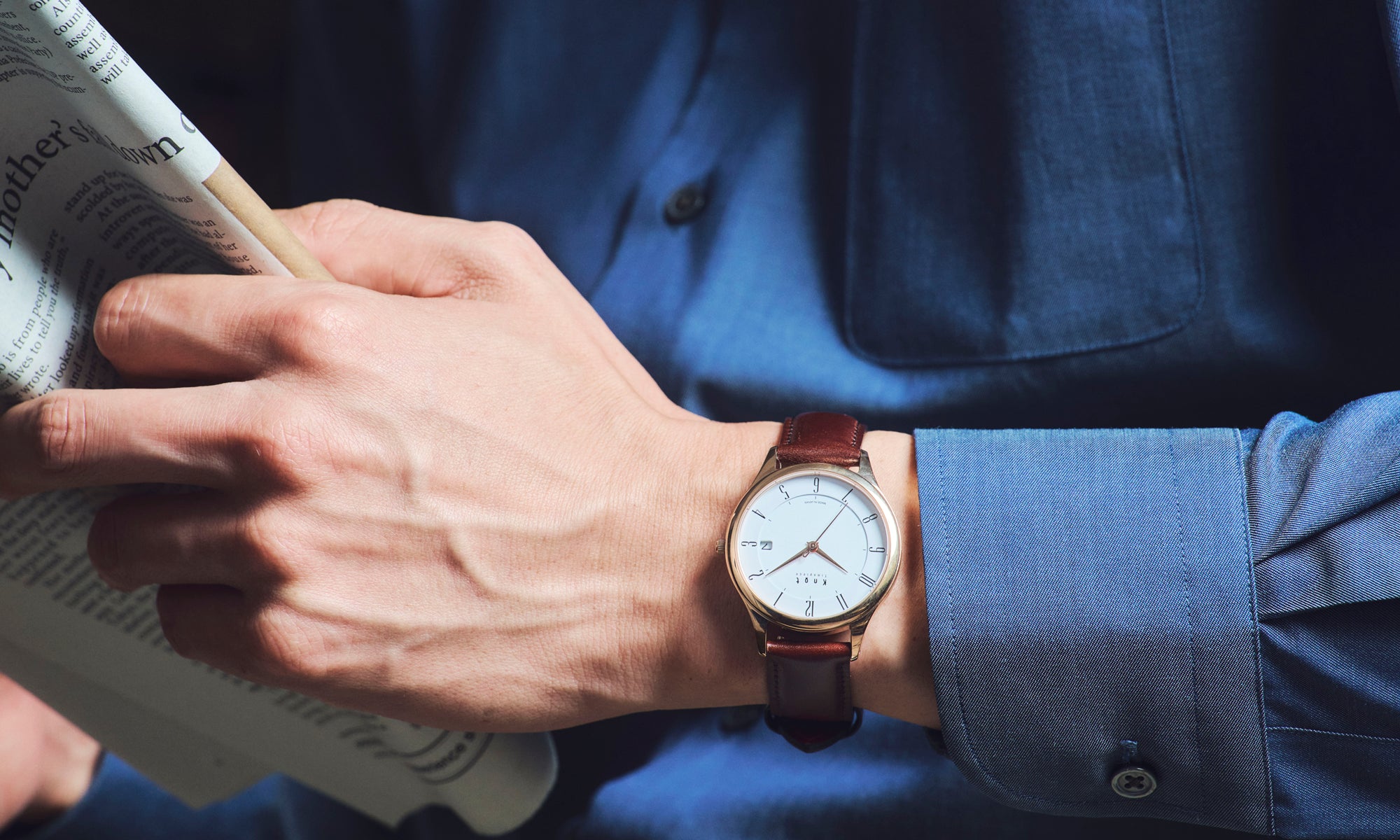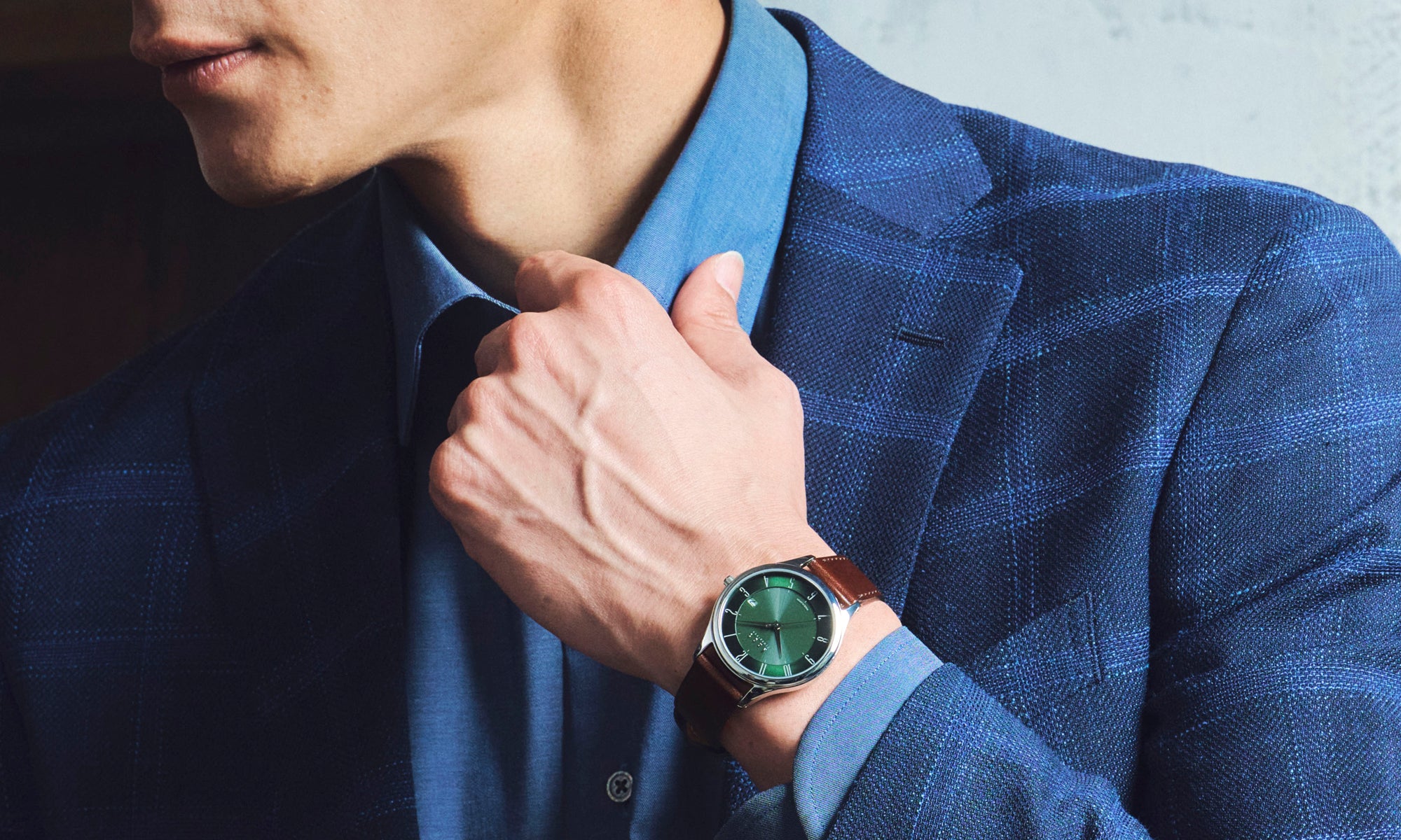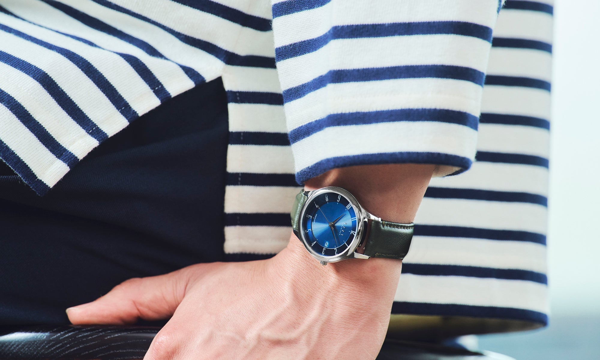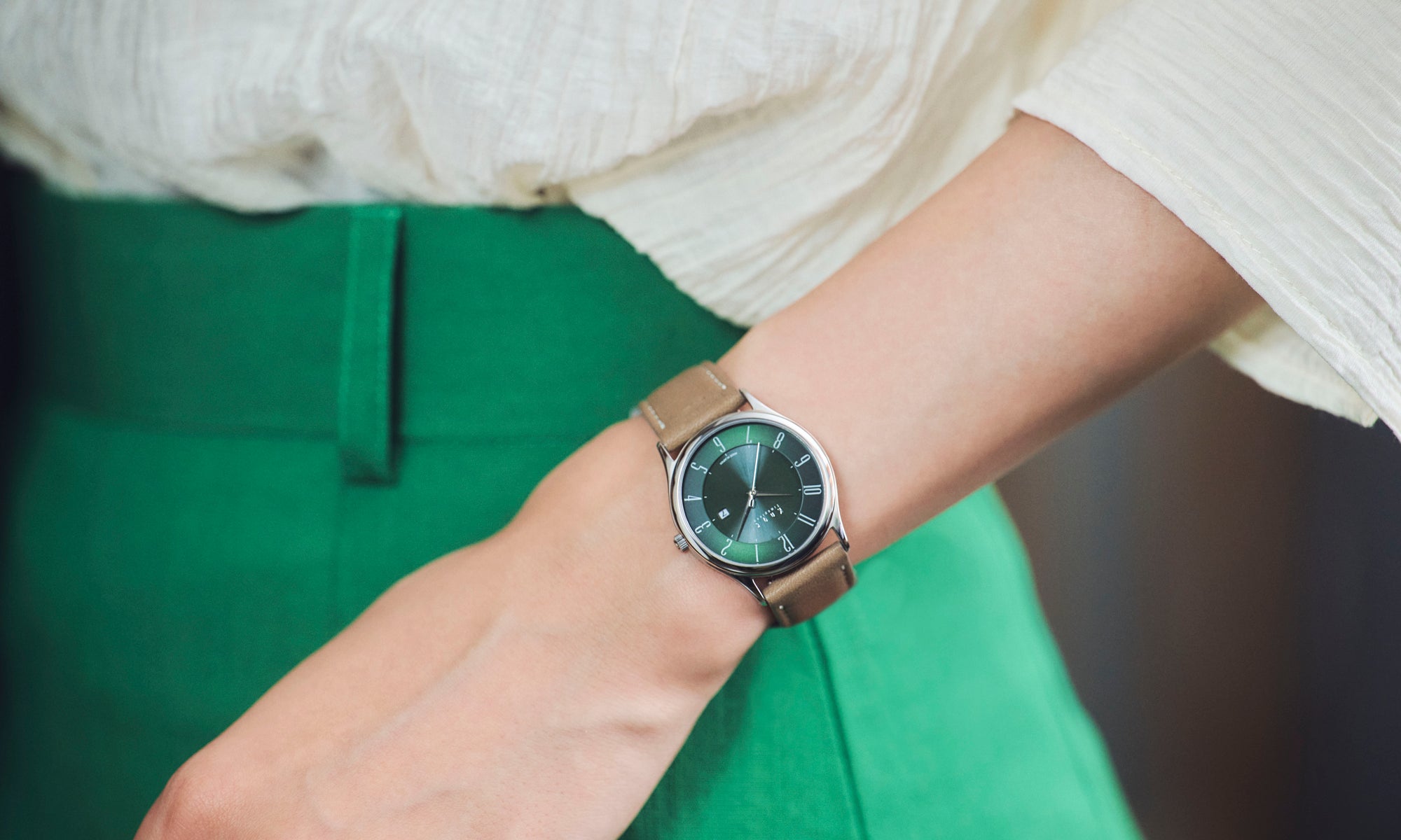 曲線でなめらかに設計されたデザインに、スリムで抑揚のあるエレガントなフォント。カラーダイアルにはサンレイ仕上げを採用し、フォーマルな装いにもフィットする、ベーシックなソーラーモデルです。