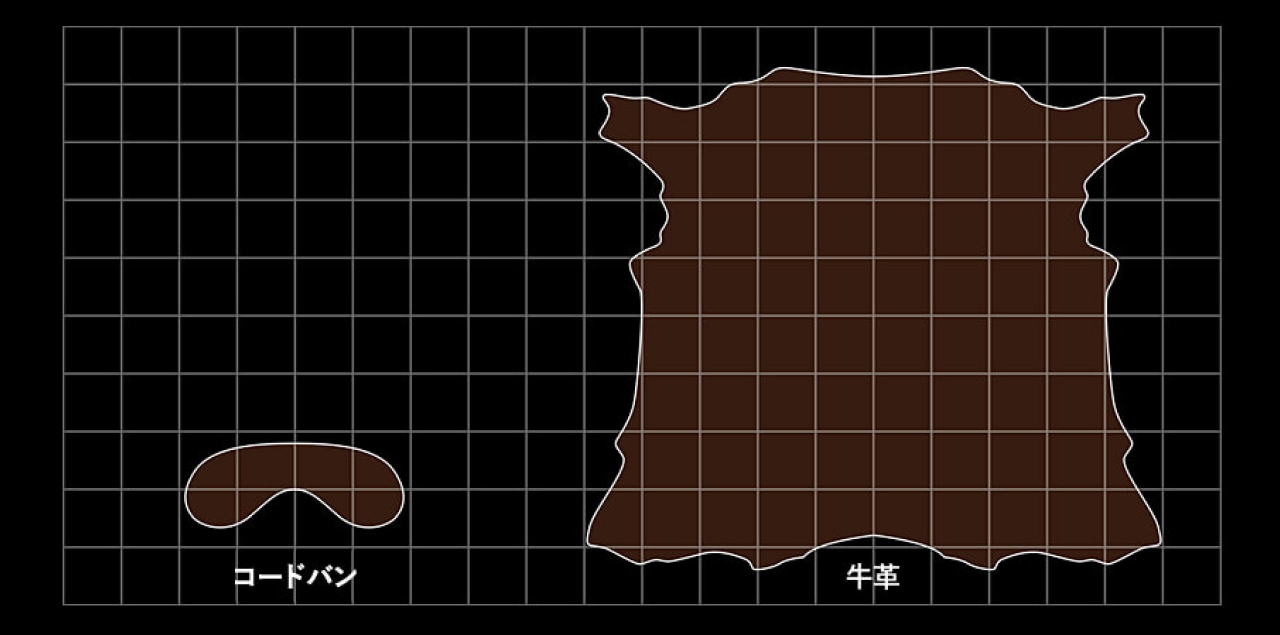 馬の臀部には厚さ2mm程度のコードバン層と呼ばれる部分があり、革にするために皮の裏側からコードバン層のみを削り出して使用します。