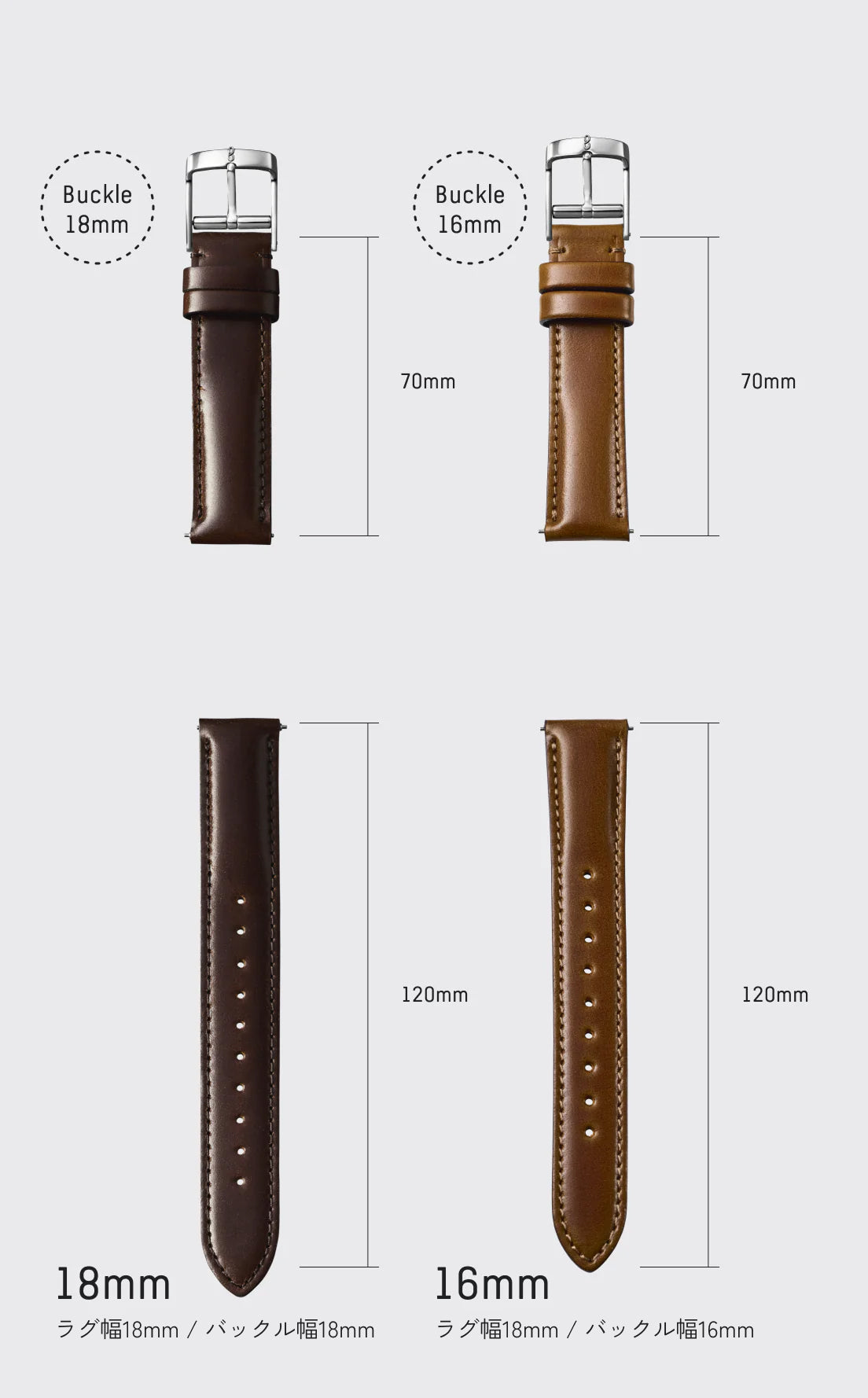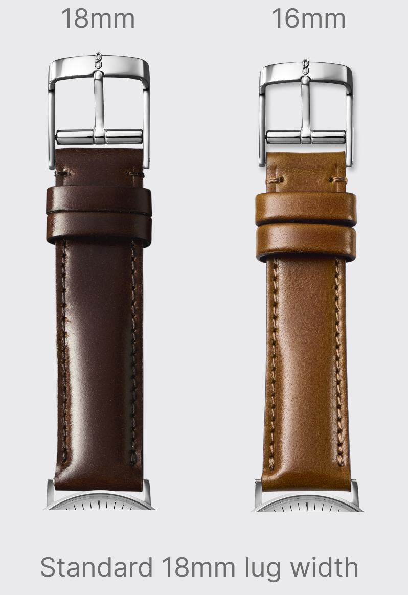 Knotの時計のラグ幅(ストラップを装着する箇所)は全て18mmで作られておりますが、ストラップのシェイプにより、バックルのサイズが2つございます。