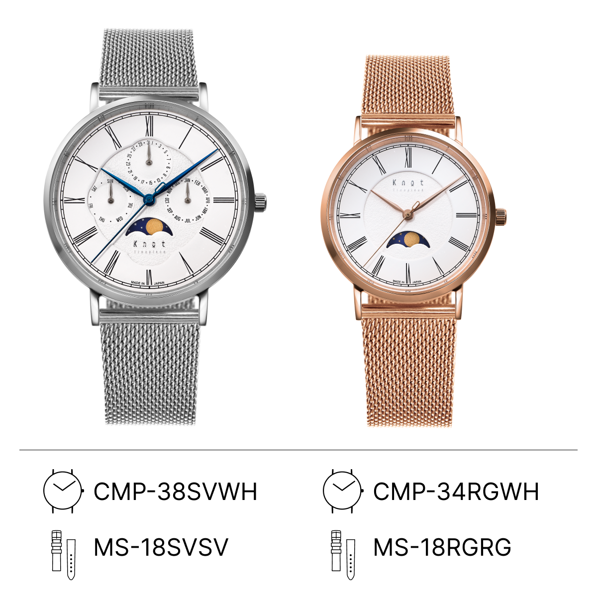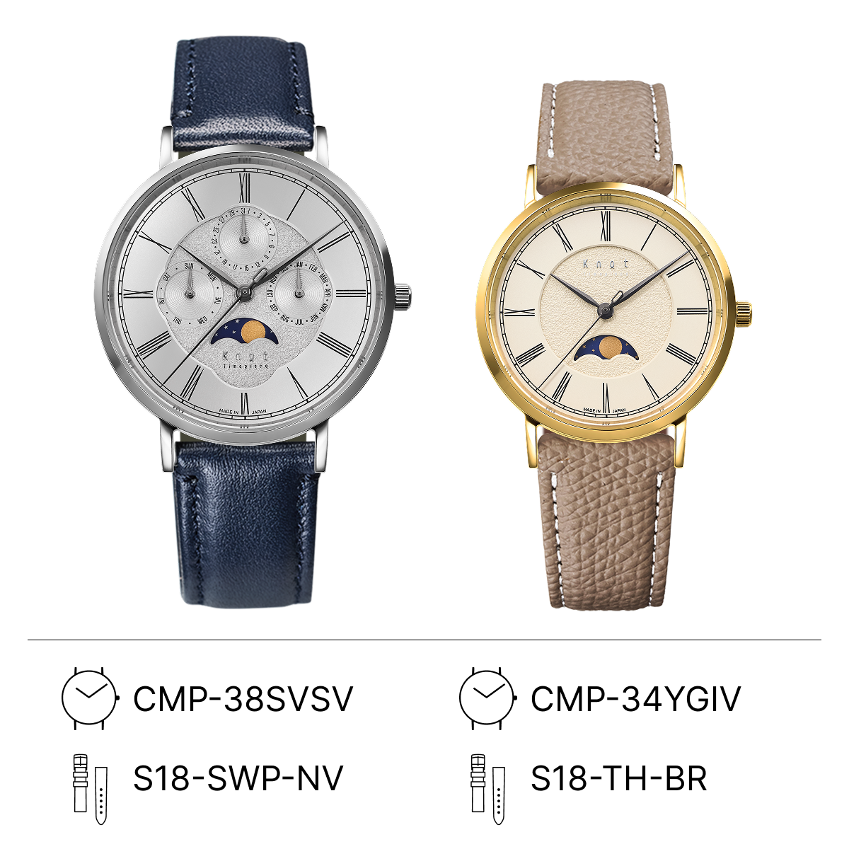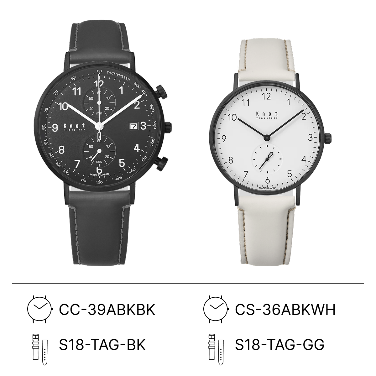 Knotの王道ペアコーディネート。フェイスデザインがシンプルだからこそ、ストラップを選んぶ楽しみが広がります。