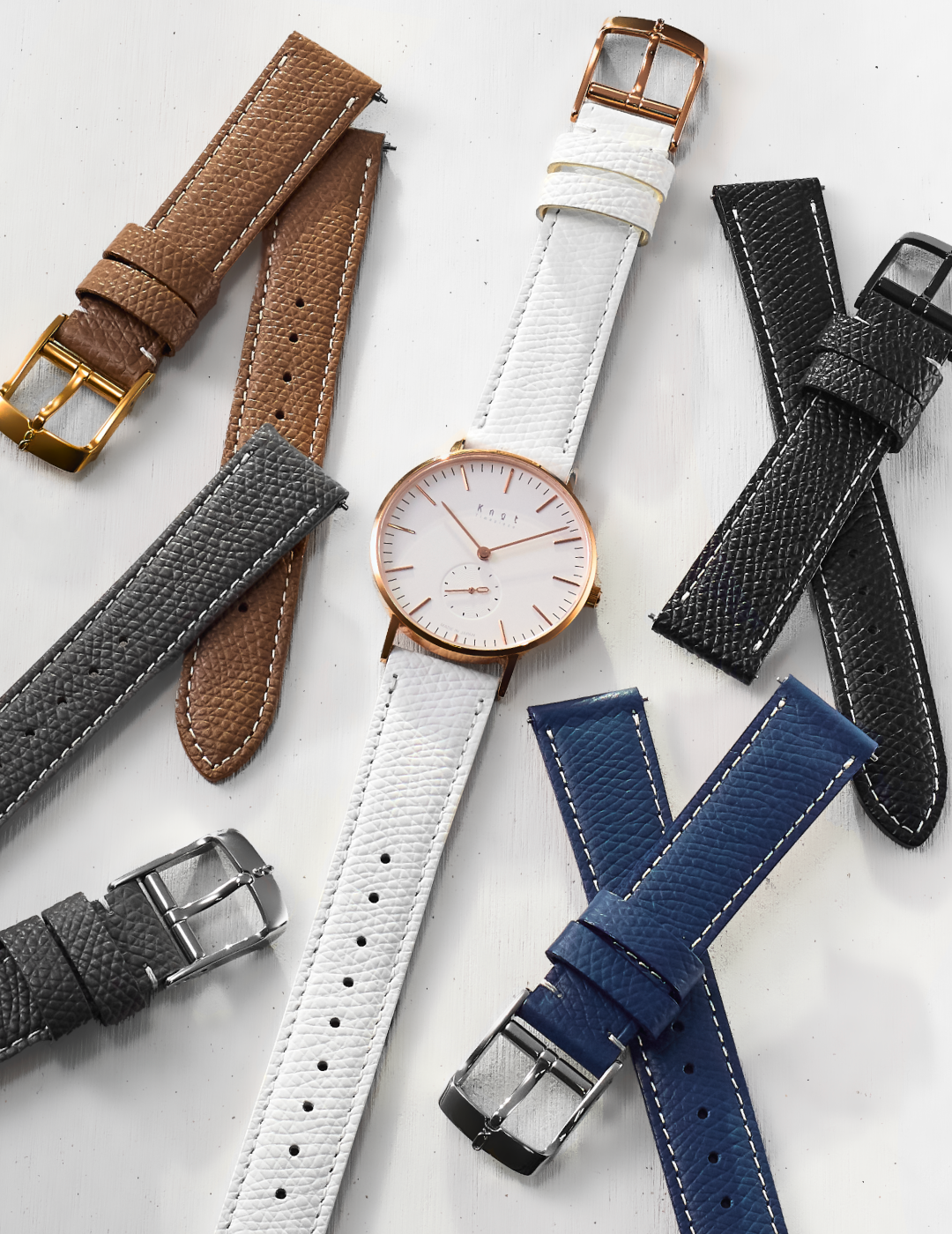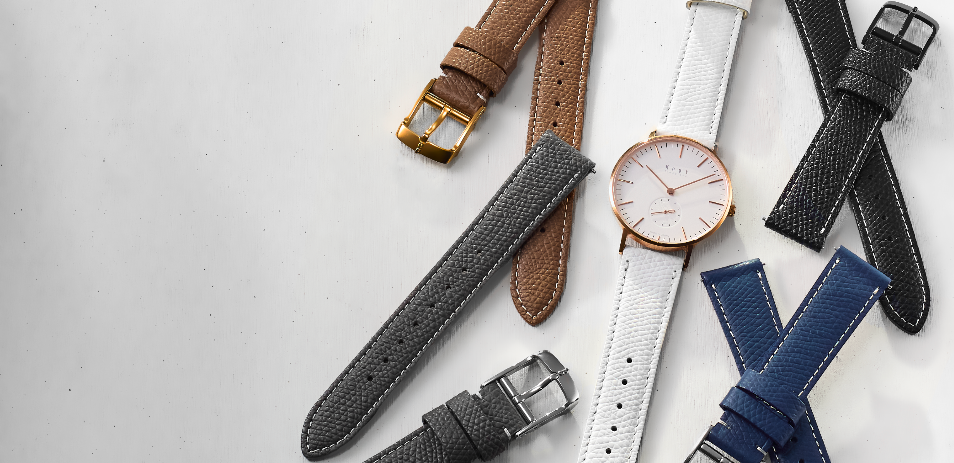 Knotの時計のラグ幅(ストラップを装着する箇所)は全て18mmで作られておりますが、ストラップのシェイプにより、バックルのサイズが2つございます。
