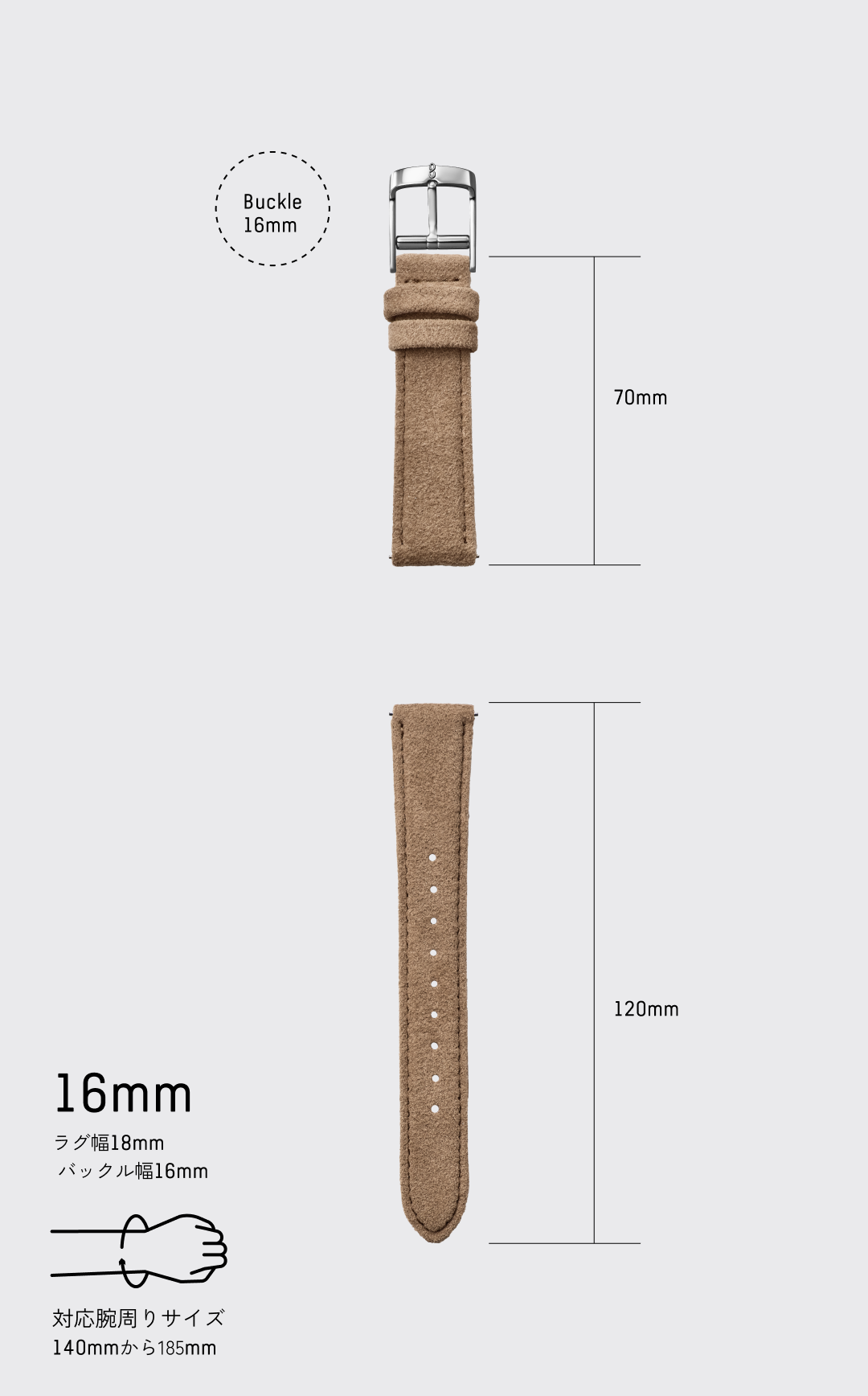 Knotの時計のラグ幅(ストラップを装着する箇所)は全て18mmで作られておりますが、ストラップのシェイプにより、バックルのサイズが2つございます。