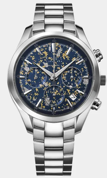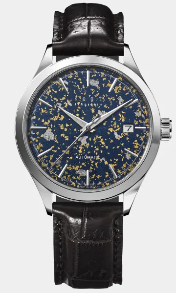 「切り廻し」と呼ばれる技法でプラチナ箔をフレーク状に加工し、藍色に染め上げた文字盤へ丁寧に敷き詰めます。