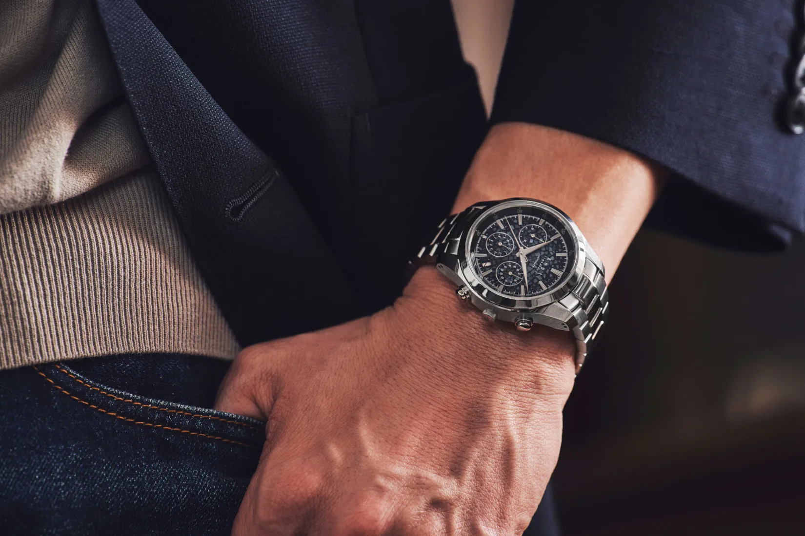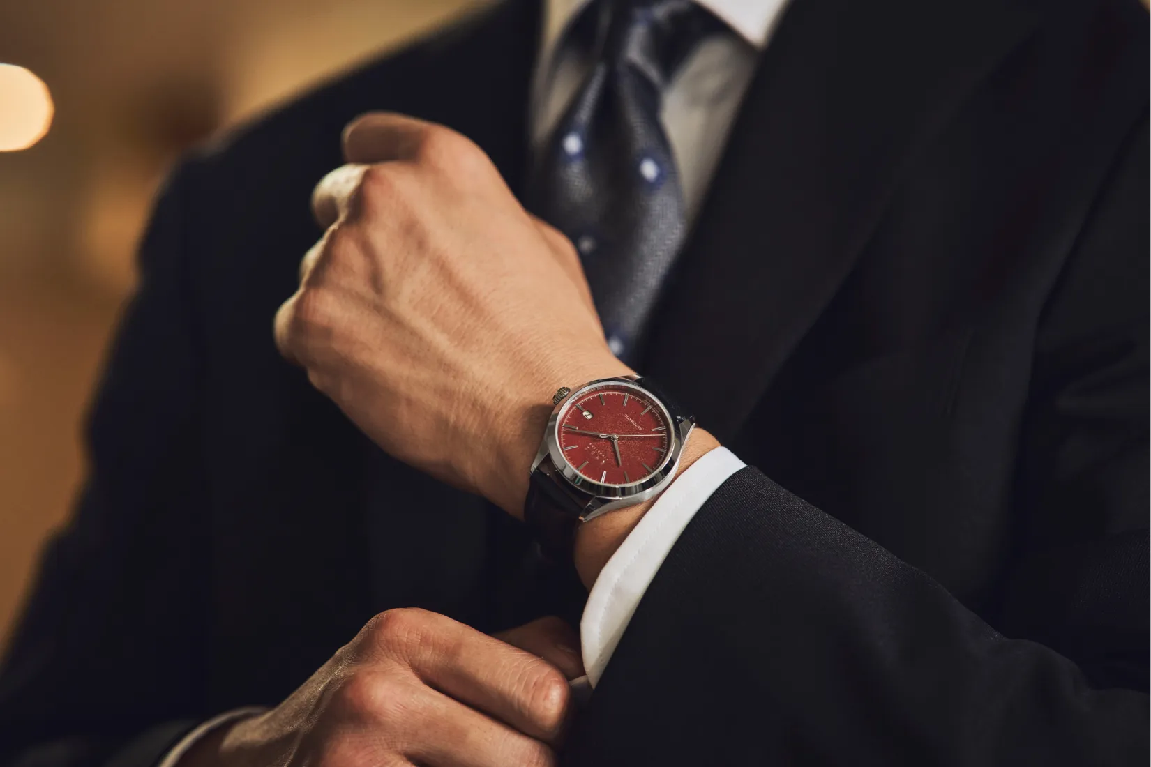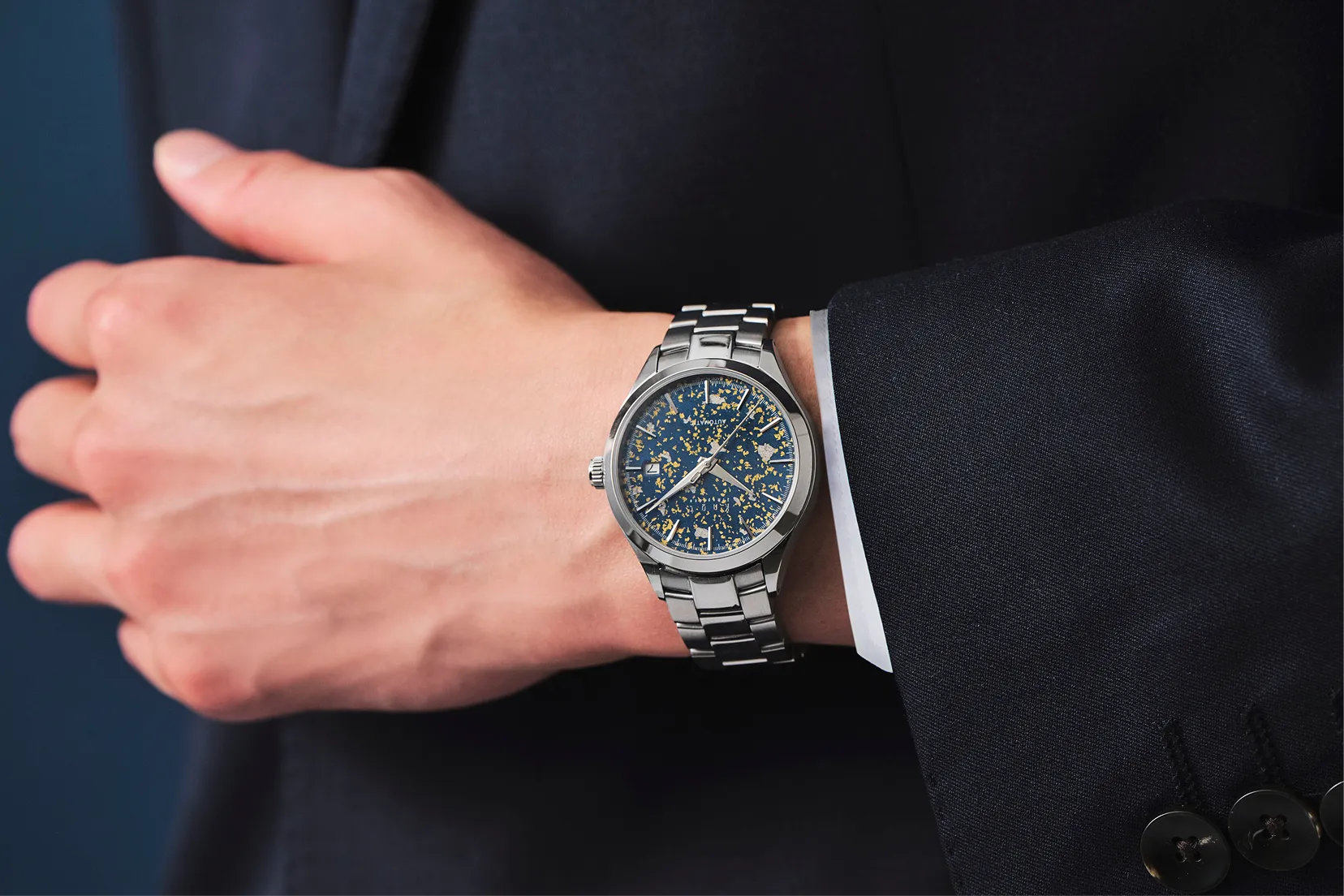 20年以上にわたり箔の表現を探求してきた宮城氏は、「小さな文字盤という世界に偶然性と緻密さを共存させることが最大の挑戦だった」と語ります。試行錯誤を繰り返した末、竹筒を振ることで生まれる「偶然性」と一粒ずつ手で置く「必然性」を組み合わせる手法に到達。結果として一点物としての個性を宿しながら、どの個体も同等でバランスのいい箔表現を実現しています。