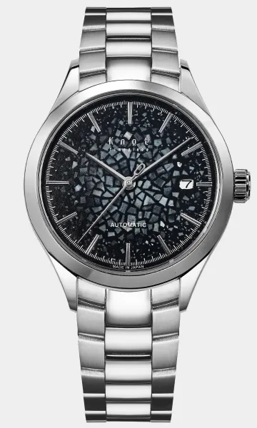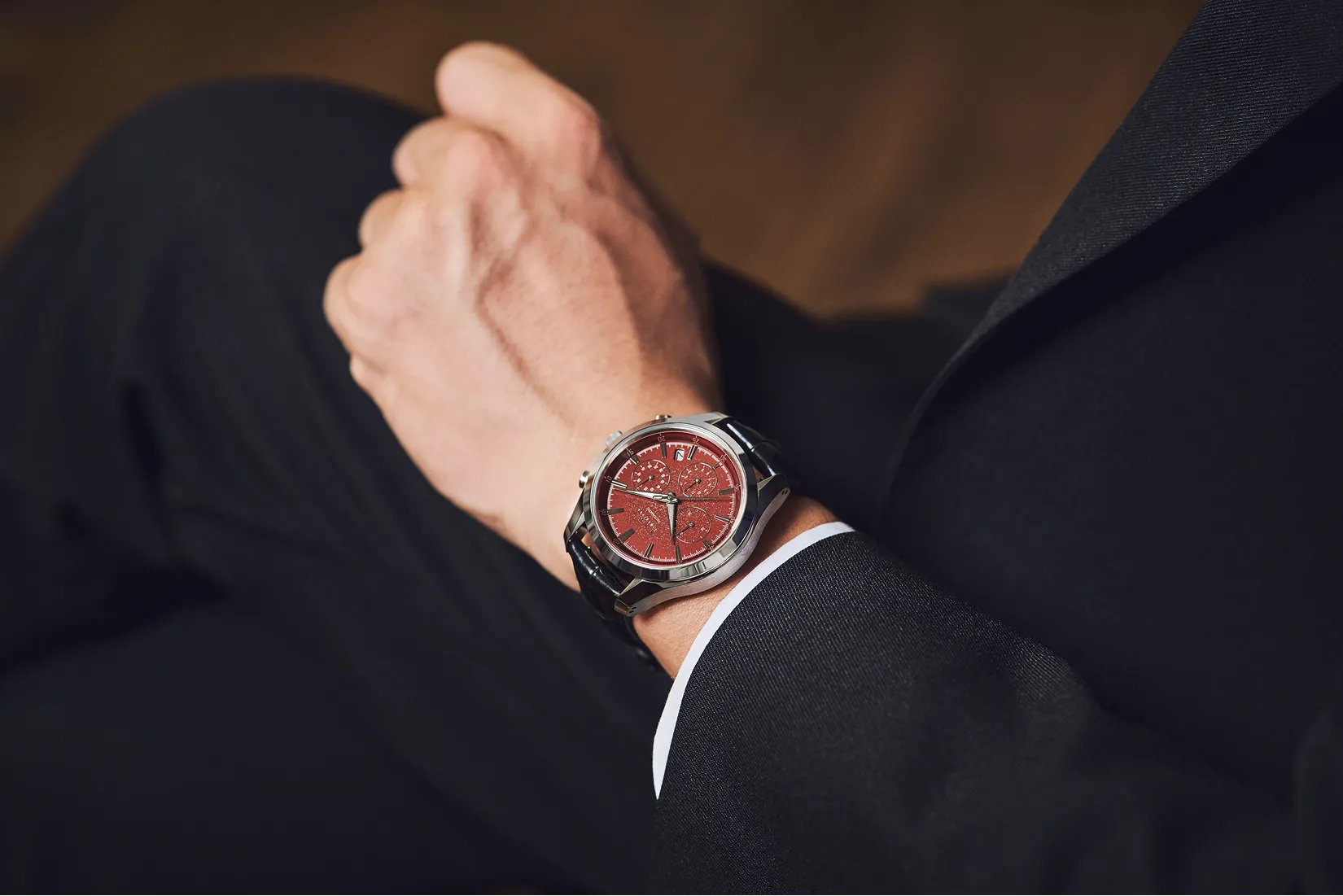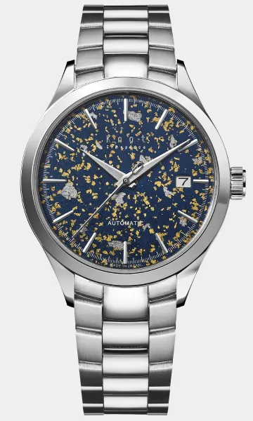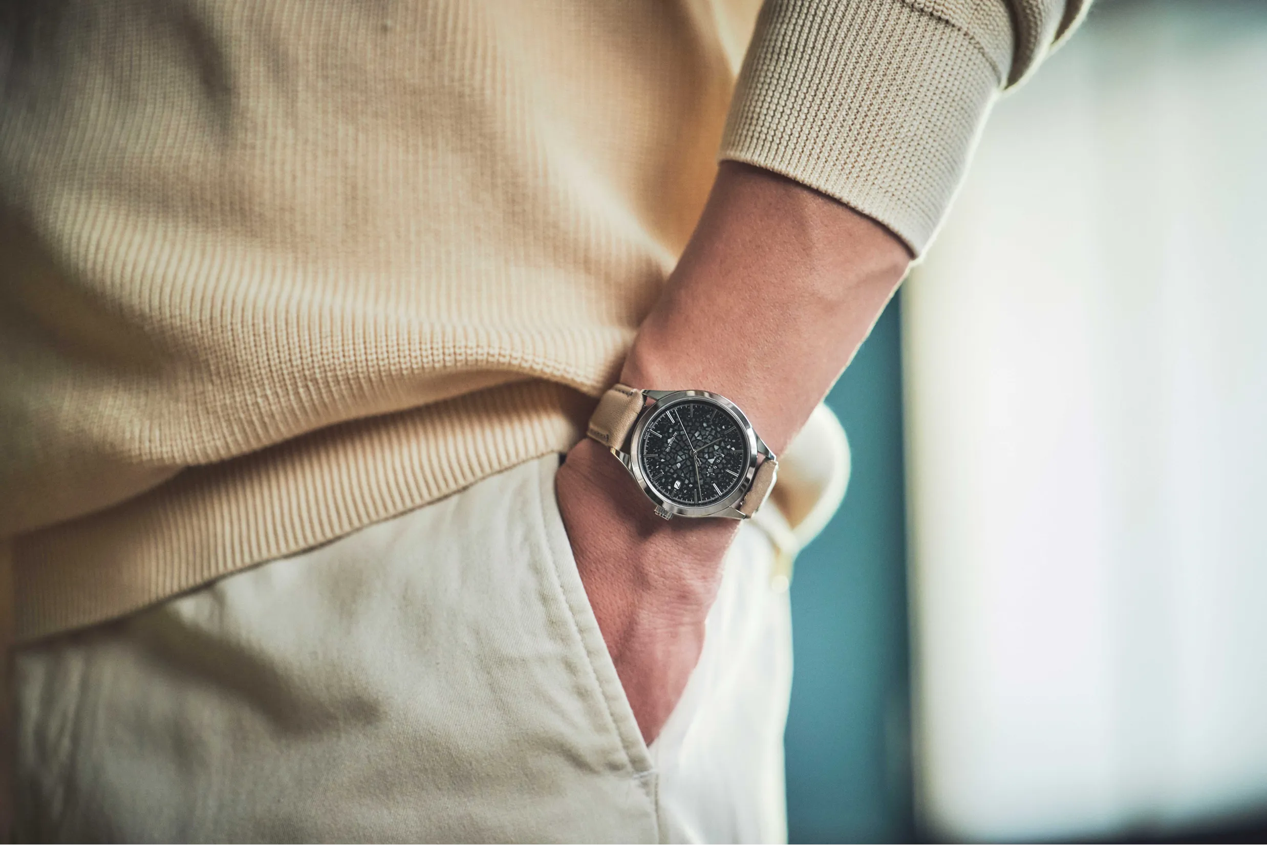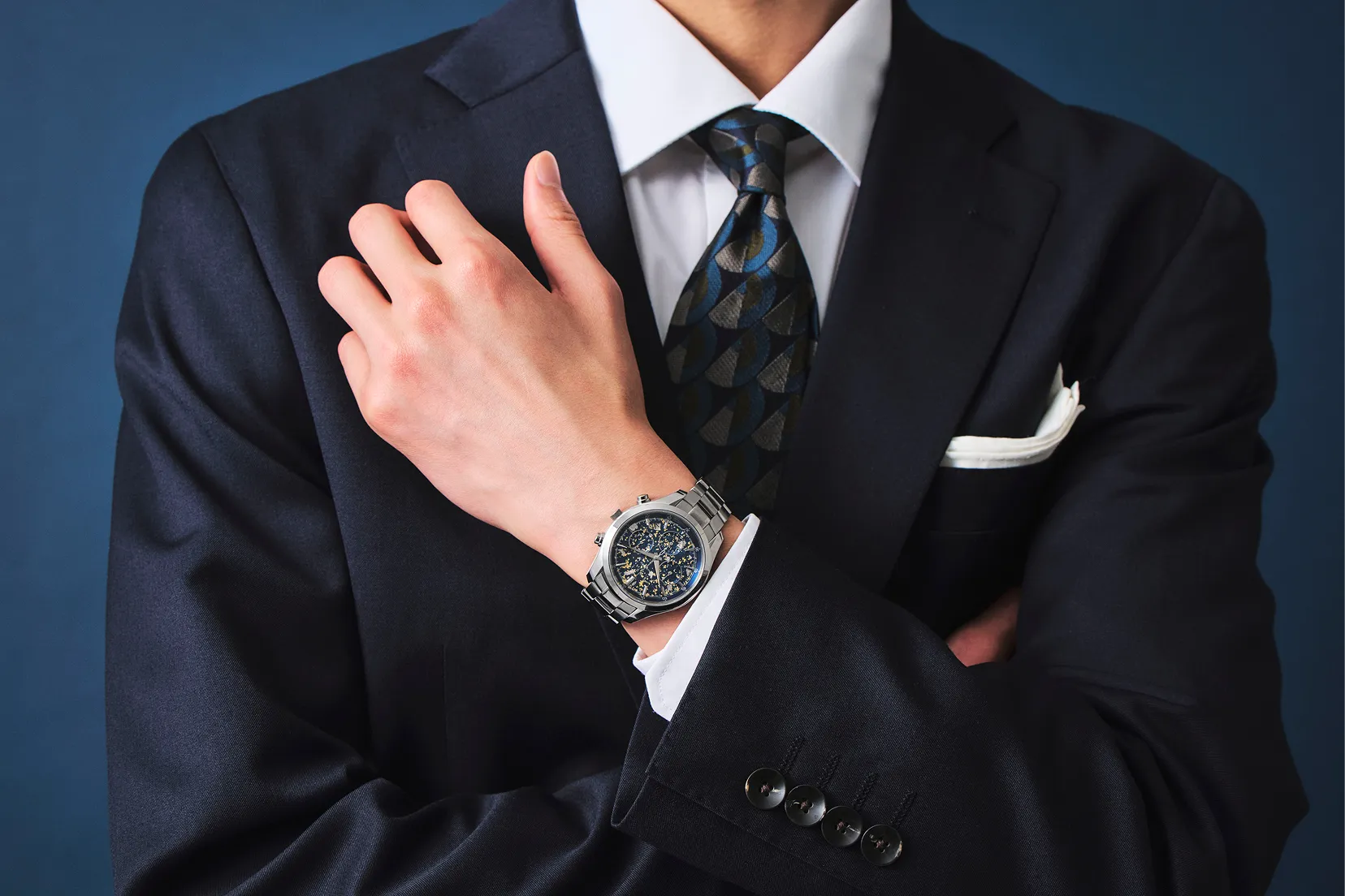 20年以上にわたり箔の表現を探求してきた宮城氏は、「小さな文字盤という世界に偶然性と緻密さを共存させることが最大の挑戦だった」と語ります。試行錯誤を繰り返した末、竹筒を振ることで生まれる「偶然性」と一粒ずつ手で置く「必然性」を組み合わせる手法に到達。結果として一点物としての個性を宿しながら、どの個体も同等でバランスのいい箔表現を実現しています。