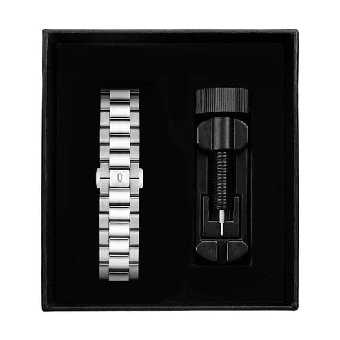 STRAP:機械式のプレミアムモデルのためだけに作られた、専用ストラップ。プレミアムモデルに相応しい重厚感と、ケースに隙間なくフィットする美しいシェイプを追究しました。センターは鏡面仕上げ、サイドの2列はヘアライン加工と仕上げを変えることにより、光が当たった時に高級感のある立体感が感じられます。