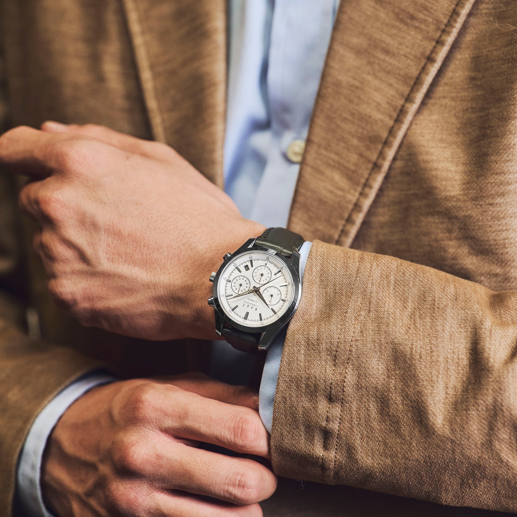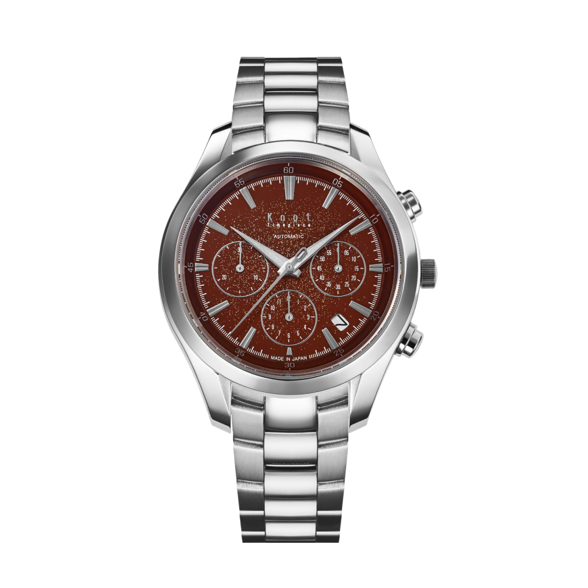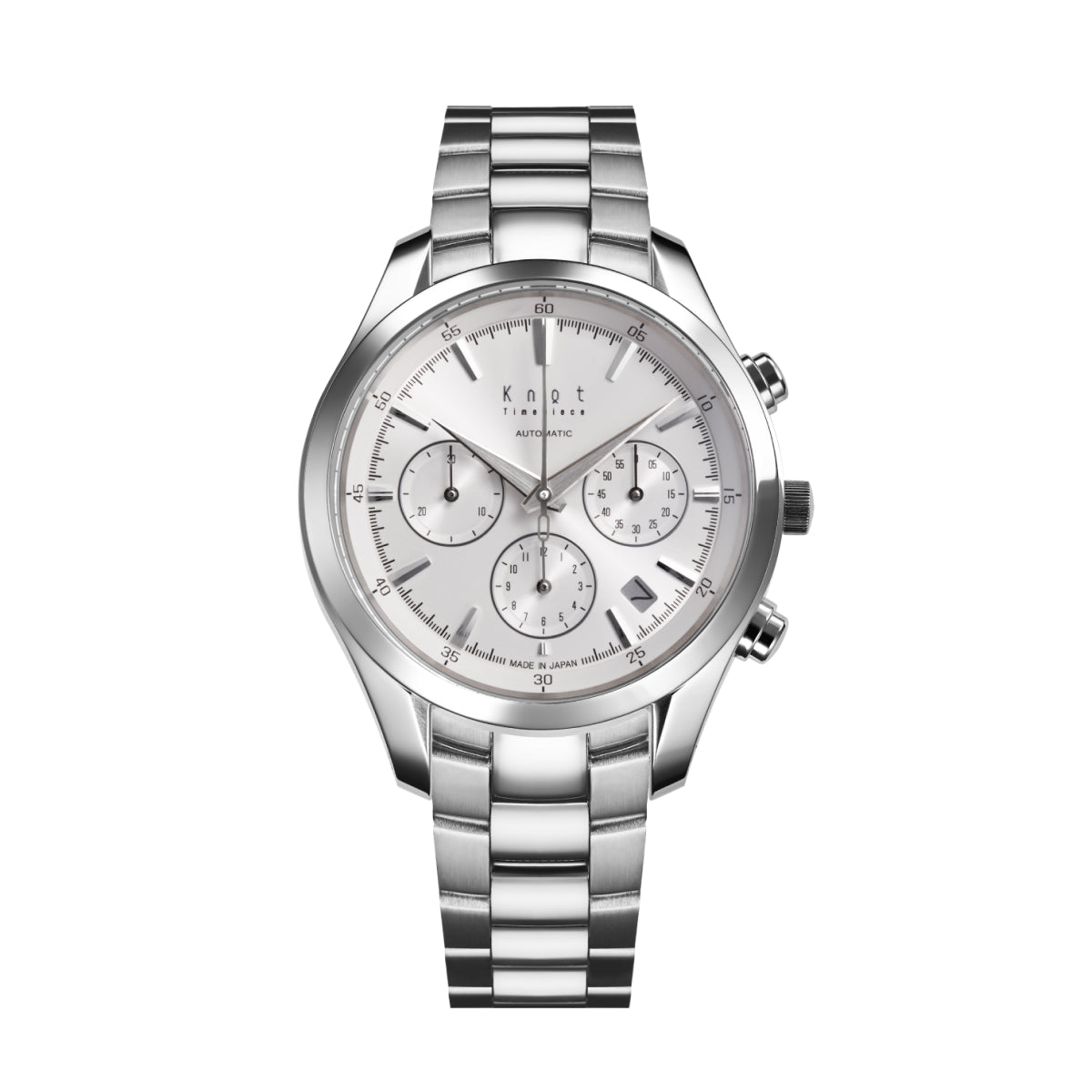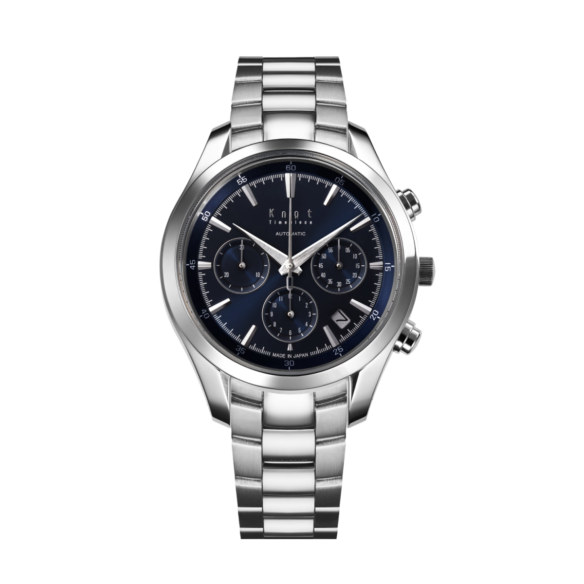 このムーブメントを使うなら、ぜひ一緒につくりたい。Knotに協力してくれるパートナーの方たちは、口々にそう言いました。国産高級時計でもほとんど目にしない、機械式クロノグラフムーブメント。それを多くの人にとって手の届く価格で。直径40mmの重厚なケースはラグジュアリーな大人の腕元を演出します。