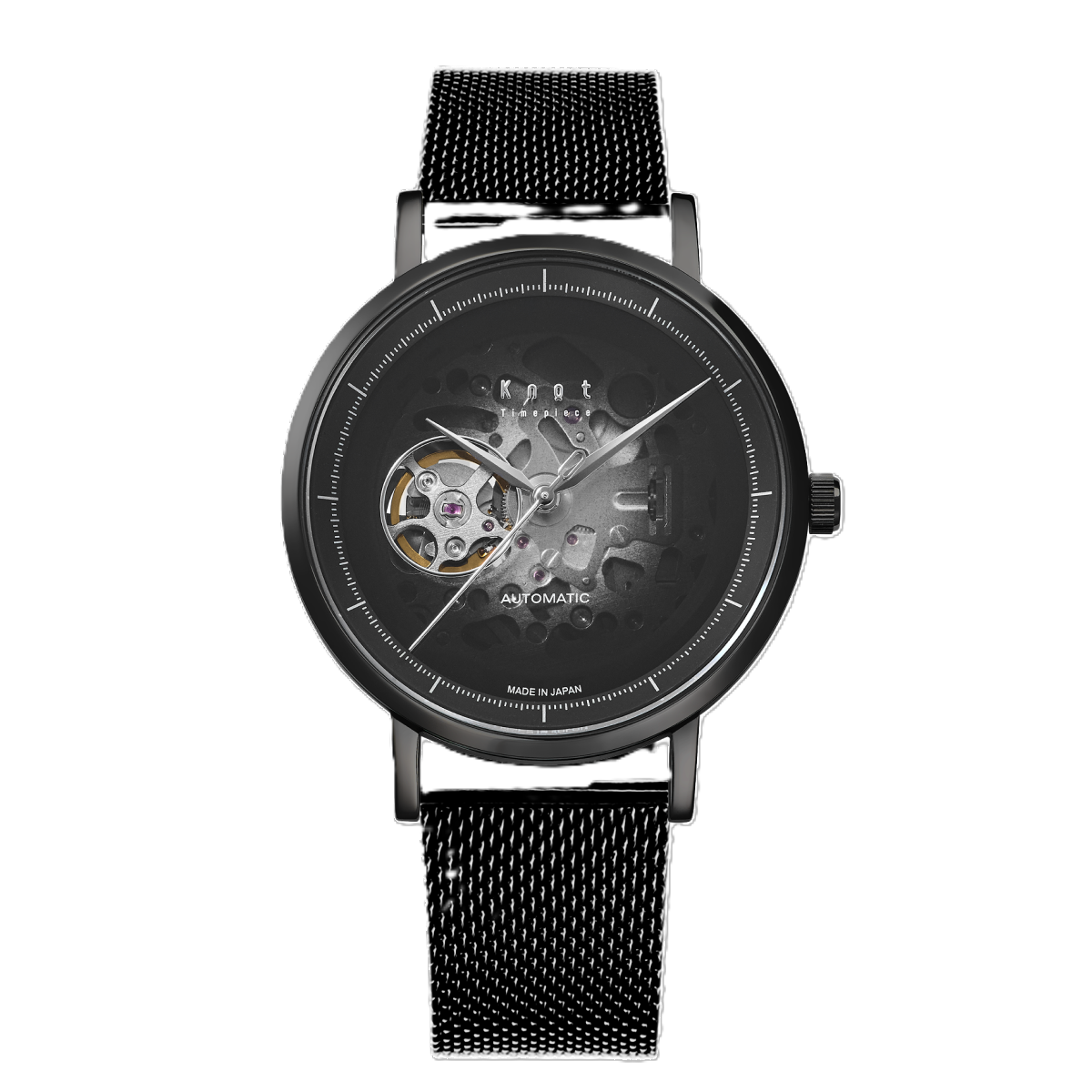 正面から機械式ムーブメントの様子を眺められるスケルトンの特徴を備えながら、グラデーション塗装やシンプルなデザインによってミステリアスな雰囲気をまとい、知的好奇心を呼び覚まします。
