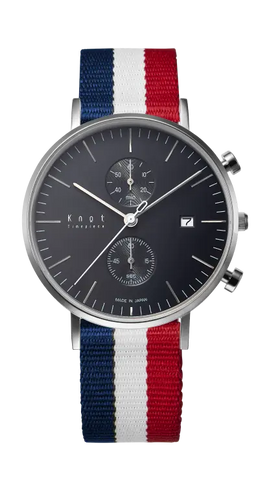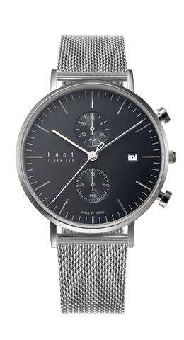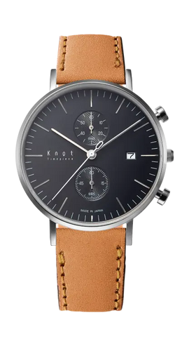 懐中時計をベースとし、視認性を重んじた精悍なフェイスデザイン。39mmの少し大きめなケースは、男性はもちろん女性があえて大きめを着用するのもおすすめです。ヴィンテージ感漂う画鋲型のプッシュボタンや、美しく放射状に輝く2カウンターなどデザインの細部に至るまでこだわり抜いたKnot定番のクロノグラフ。