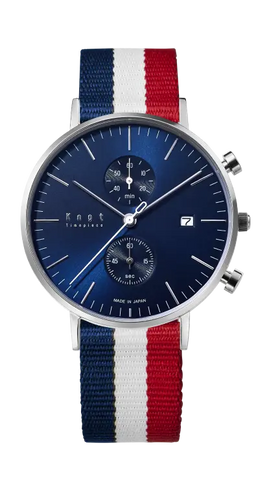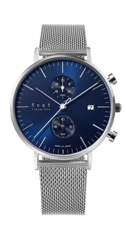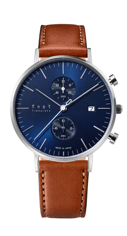 懐中時計をベースとし、視認性を重んじた精悍なフェイスデザイン。39mmの少し大きめなケースは、男性はもちろん女性があえて大きめを着用するのもおすすめです。ヴィンテージ感漂う画鋲型のプッシュボタンや、美しく放射状に輝く2カウンターなどデザインの細部に至るまでこだわり抜いたKnot定番のクロノグラフ。