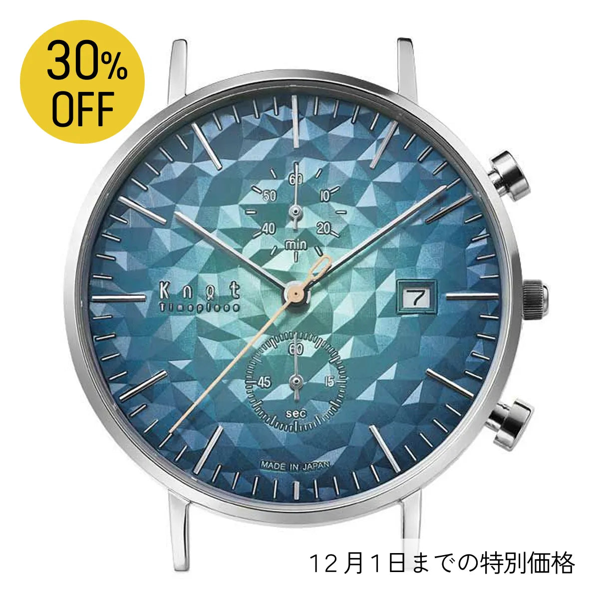 懐中時計をベースとし、視認性を重んじた精悍なフェイスデザイン。39mmの少し大きめなケースは、男性はもちろん女性があえて大きめを着用するのもおすすめです。ヴィンテージ感漂う画鋲型のプッシュボタンや、美しく放射状に輝く2カウンターなどデザインの細部に至るまでこだわり抜いたKnot定番のクロノグラフ。
