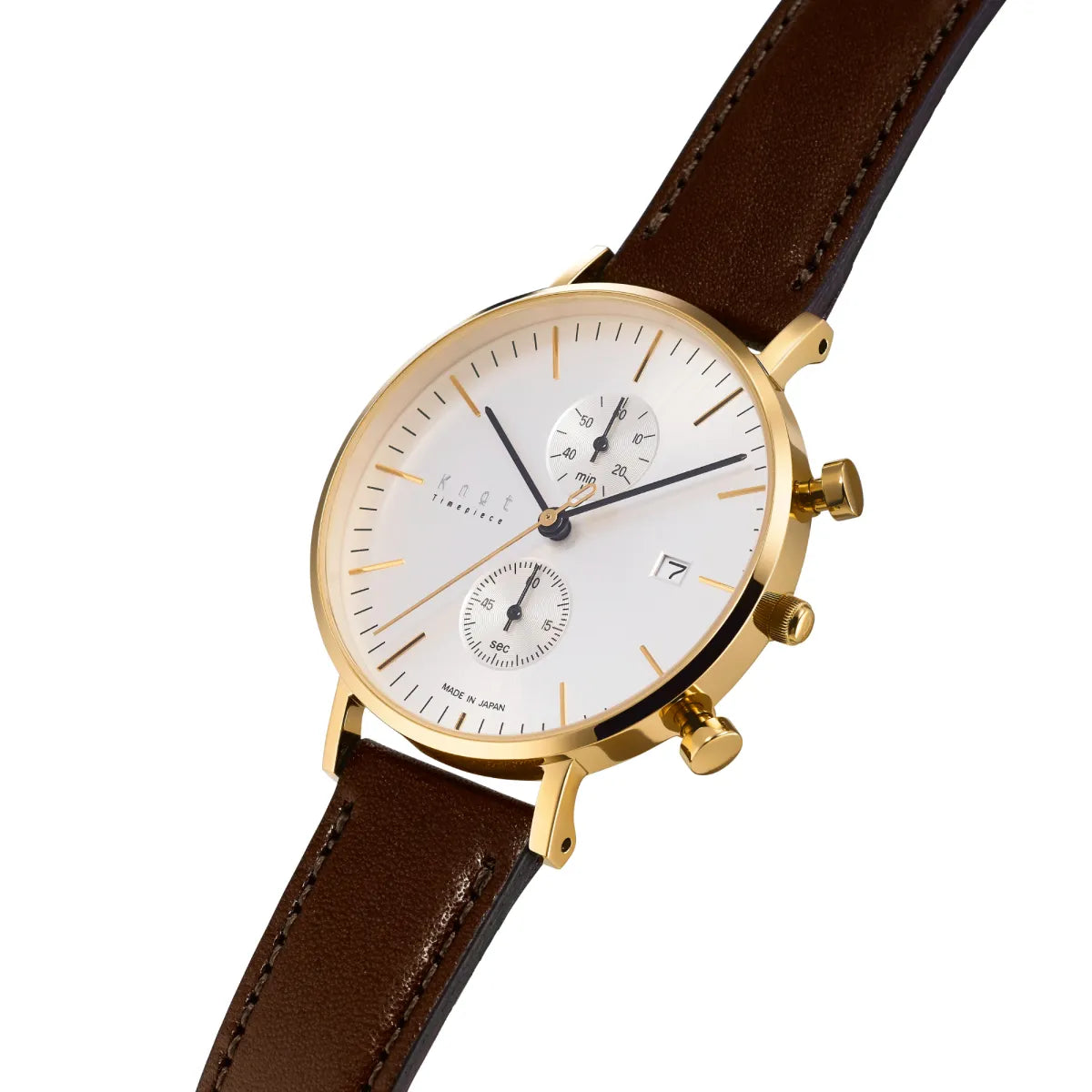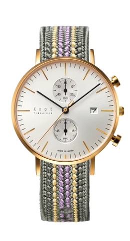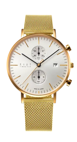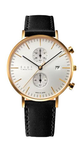 懐中時計をベースとし、視認性を重んじた精悍なフェイスデザイン。39mmの少し大きめなケースは、男性はもちろん女性があえて大きめを着用するのもおすすめです。ヴィンテージ感漂う画鋲型のプッシュボタンや、美しく放射状に輝く2カウンターなどデザインの細部に至るまでこだわり抜いたKnot定番のクロノグラフ。
