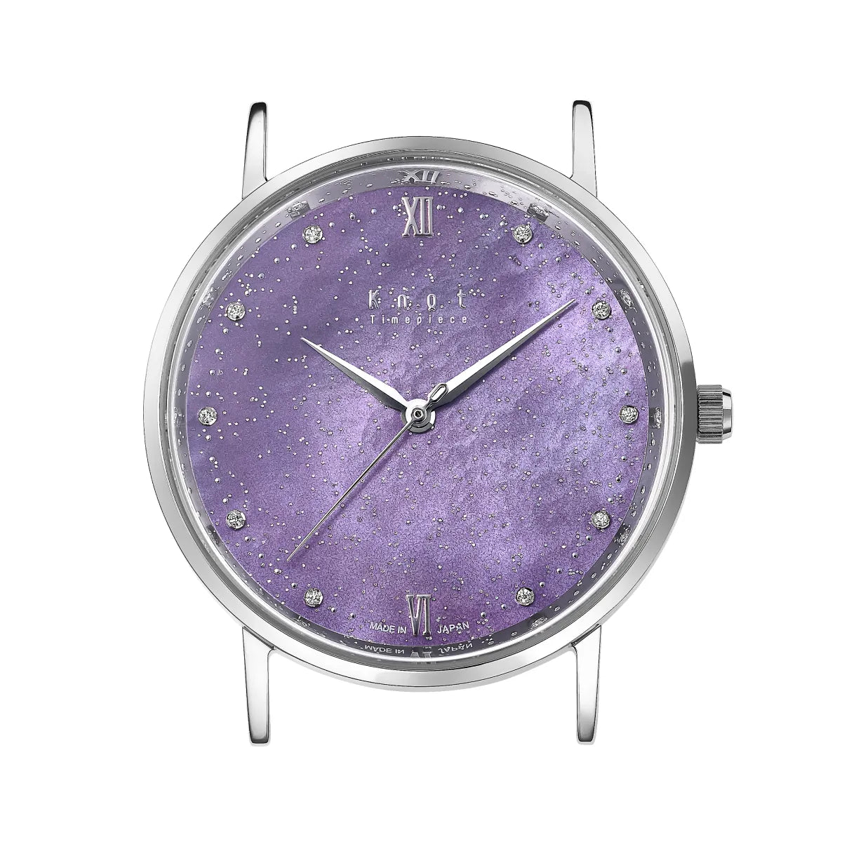 紫陽花の色彩を表現するため、ダイヤルには光を受けて七色に輝くマザー・オブ・パールを採用。インデックスには、きらめく10個のダイヤモンドをセッティング。さらにダイヤル全体にラメを乗せ、雨粒に濡れる紫陽花を思わせるような情感にあふれる表現を施しました。