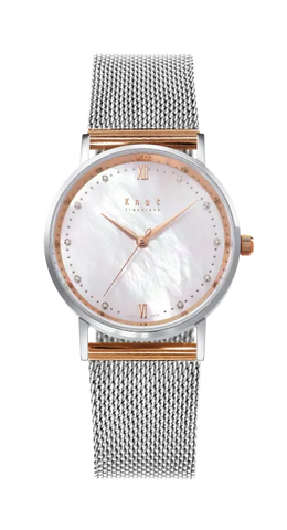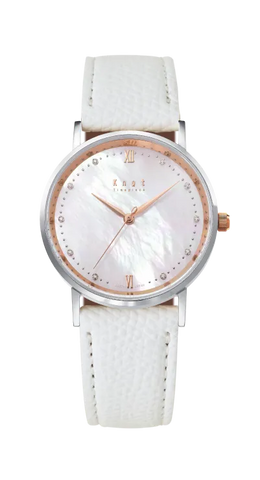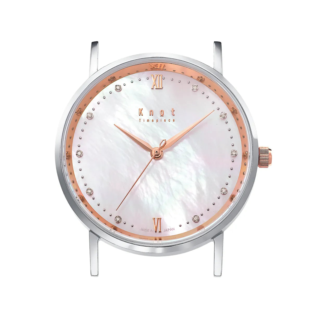 Knotの定番、クラシックシリーズのデザインを継承しながらマザーオブパールの文字盤にダイヤモンドを10石散りばめた、ラグジュアリーなデザイン。文字板のマザーオブパールは光沢や色合いがまったく同じものはなく、オンリーワンの希少性も魅力。アクセサリーやジュエリー感覚で活躍するモデルです。