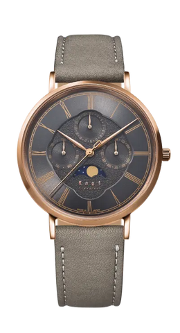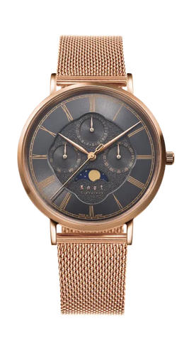 機械式時計の「複雑機構」として古くから人気の高いムーンフェイズ機構。ムーンフェイズ板の回転により満月や三日月などの「月相」を知ることができる機能を、クォーツ時計で表現したモデルです。ペアデザインで38mmと34mmの2つのサイズをご用意しました。