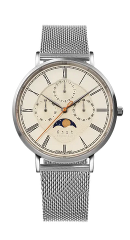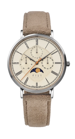 機械式時計の「複雑機構」として古くから人気の高いムーンフェイズ機構。ムーンフェイズ板の回転により満月や三日月などの「月相」を知ることができる機能を、クォーツ時計で表現したモデルです。ペアデザインで38mmと34mmの2つのサイズをご用意しました。