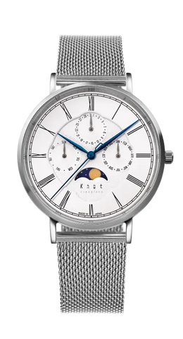 機械式時計の「複雑機構」として古くから人気の高いムーンフェイズ機構。ムーンフェイズ板の回転により満月や三日月などの「月相」を知ることができる機能を、クォーツ時計で表現したモデルです。ペアデザインで38mmと34mmの2つのサイズをご用意しました。