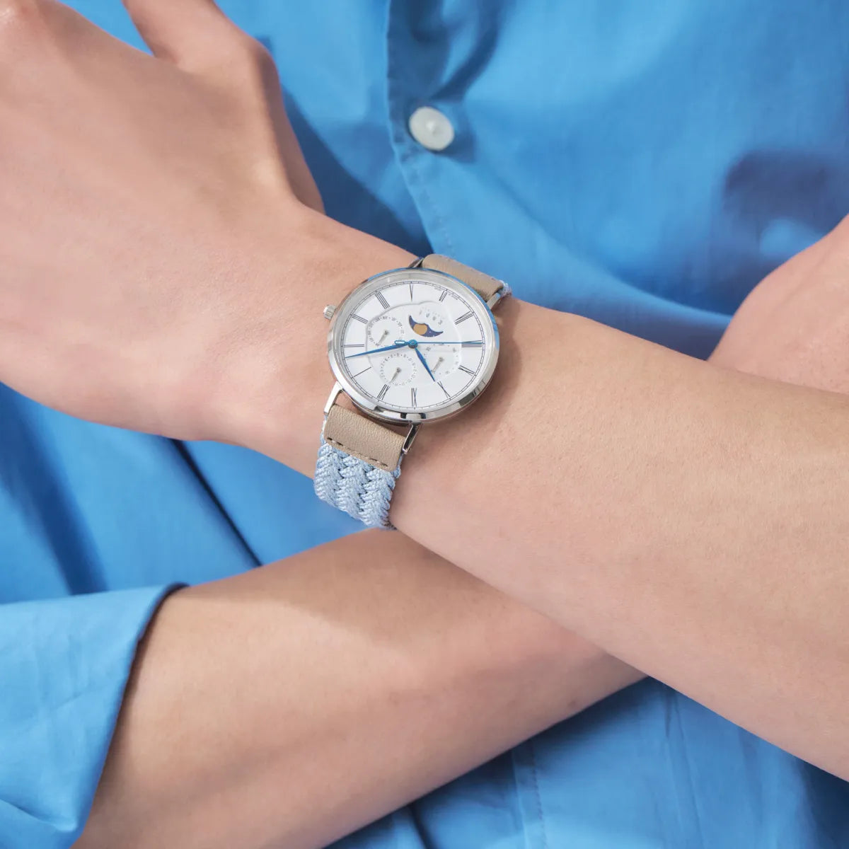 十三の組紐をさらに1本1本組み込むことでストラップへと昇華した、全く新しい組紐リストウェアです。耐久性の高く、高級シルク調ポリエステルと、バックル部分には防水レザーを採用することで、ハードな水洗いにも耐えうる仕様になっています。