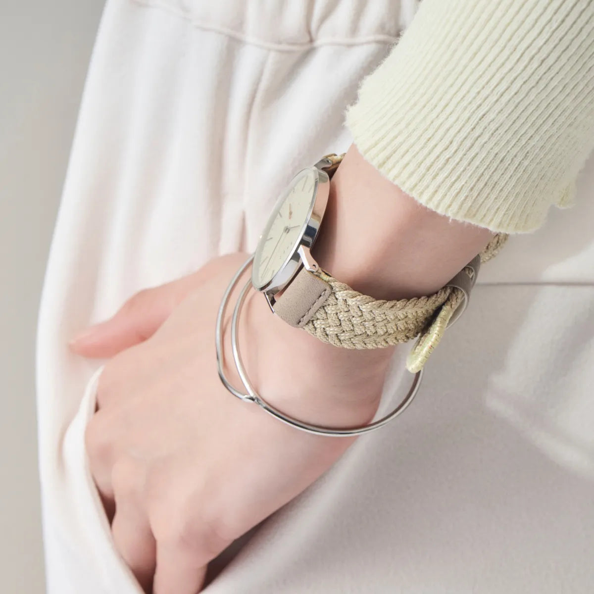 十三の組紐をさらに1本1本組み込むことでストラップへと昇華した、全く新しい組紐リストウェアです。耐久性の高く、高級シルク調ポリエステルと、バックル部分には防水レザーを採用することで、ハードな水洗いにも耐えうる仕様になっています。