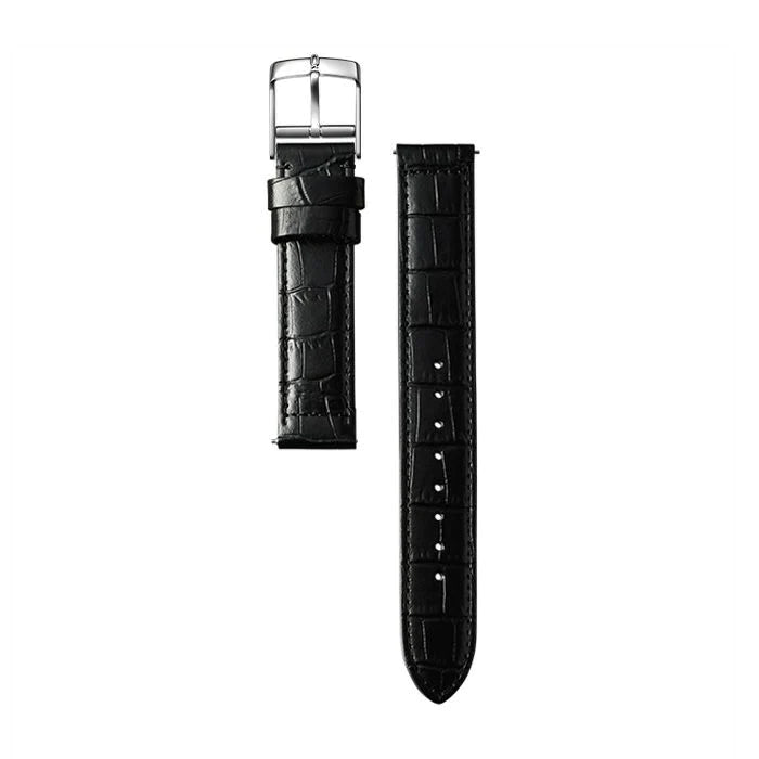 国内でなめした高品質なレザーに細かい凹凸を繊細に表現する日本の型押し技術を用い、風合い豊かなクロコダイルスタンパードレザーに仕上げました。腕周りの細い女性の腕元に合うテーパードのトラディショナルシェイプと男性の腕元に合うストレート&ロングシェイプとを3色づつご用意致しました。マットな質感にすることで過美な印象を抑え、上品な仕上がりでプレミアムシリーズに迫るラグジュアリーなストラップは腕元に華やかさをもたらします。