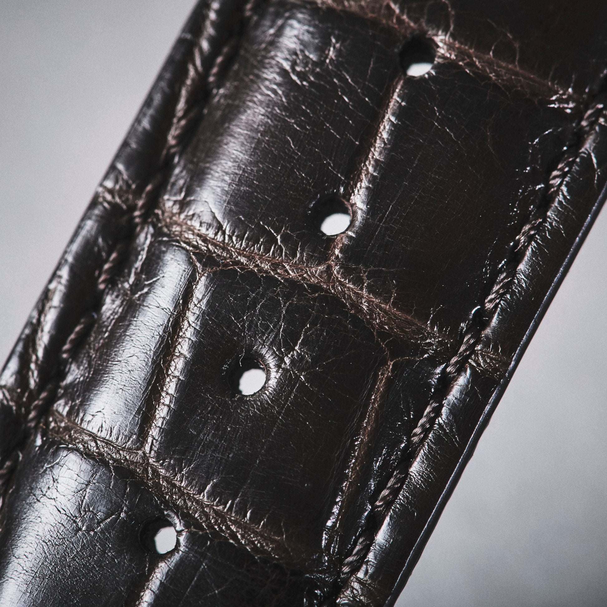 小穴すべてを職人の手作業により一つ一つコバを塗り込み。通常の製法では手間がかかりすぎるため行われない工程です。「プレミアムクロコダイルレザー」だからこそ細部まで美しさにこだわりつくした一品です。