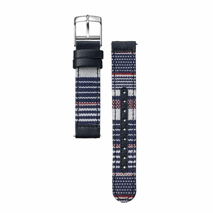 キャンバスと呼ばれバッグなどで馴染みのある帆布を採用したストラップ。一番の特徴である厚みは厚いほど製造が難しく、1年にもわたる試作、検証を重ねようやく実現しました。耐久性と柔軟性から選び抜いた8号生地は、使い始めは少し硬いですが使うほどに柔らかく馴染み、程よく色落ちします。裏に用いた栃木レザーと合わせて経年変化を楽しんでいただけます。丸い剣先をはじめ、カジュアルなデザインに仕上げました。