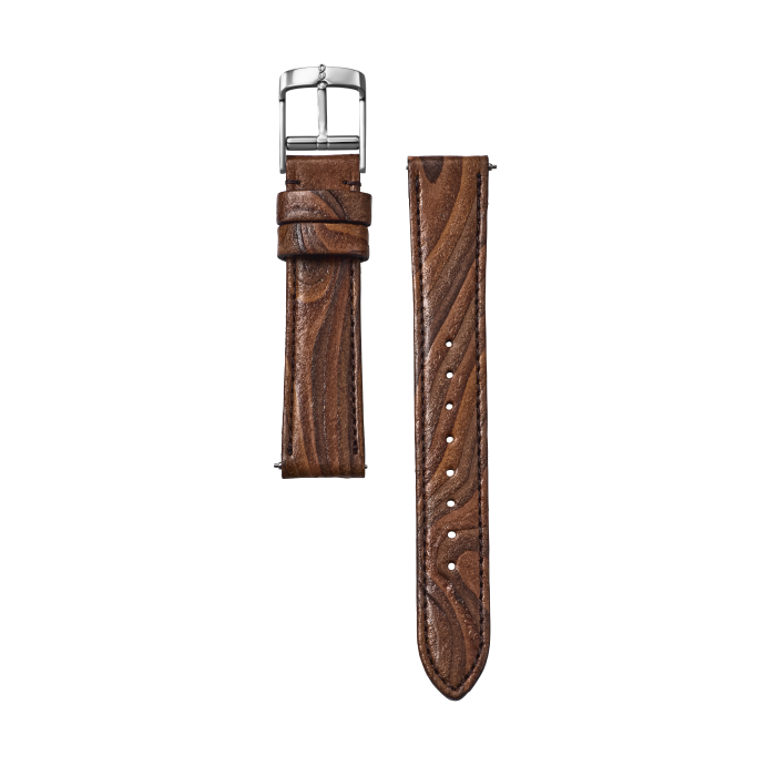 創業120余年を誇る東京・台東区の皮革工芸店「大久保商店」を営む皮革工芸職人、大久保邦雄氏が生み出す、唯一無二のレザー。「スキモレザー」とは、幾重にも貼り合わせたタンニンなめしの革を漉(す)くことで生み出される模様から、その名がつけられました。すべて大久保氏の創造力によって生み出される独創的な模様は、まさにアート作品です。一つとして同じものがない、唯一無二のスキモレザーストラップの美しさは一度見たら、忘れられません。